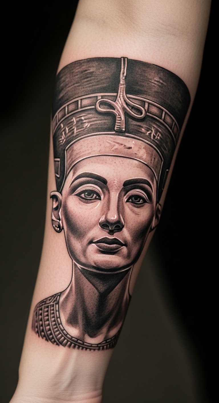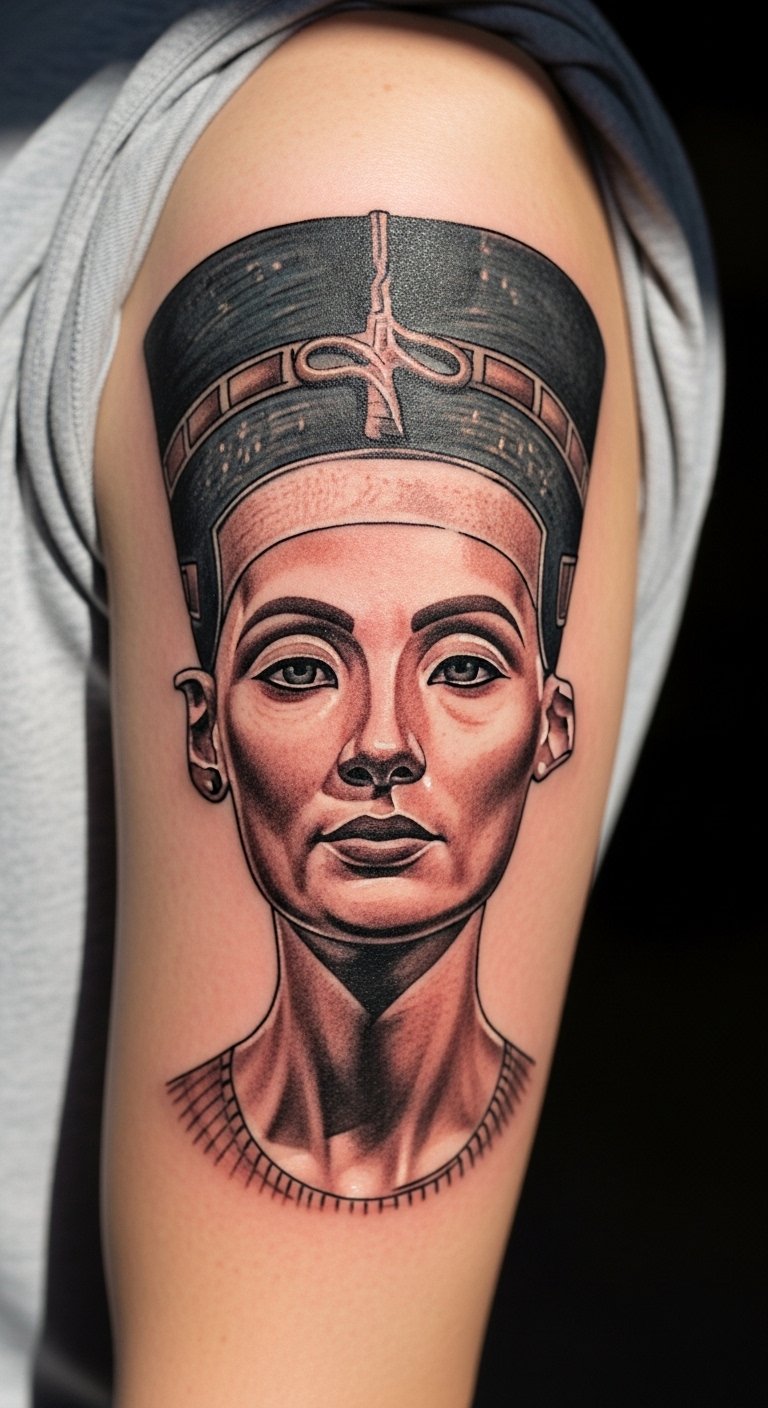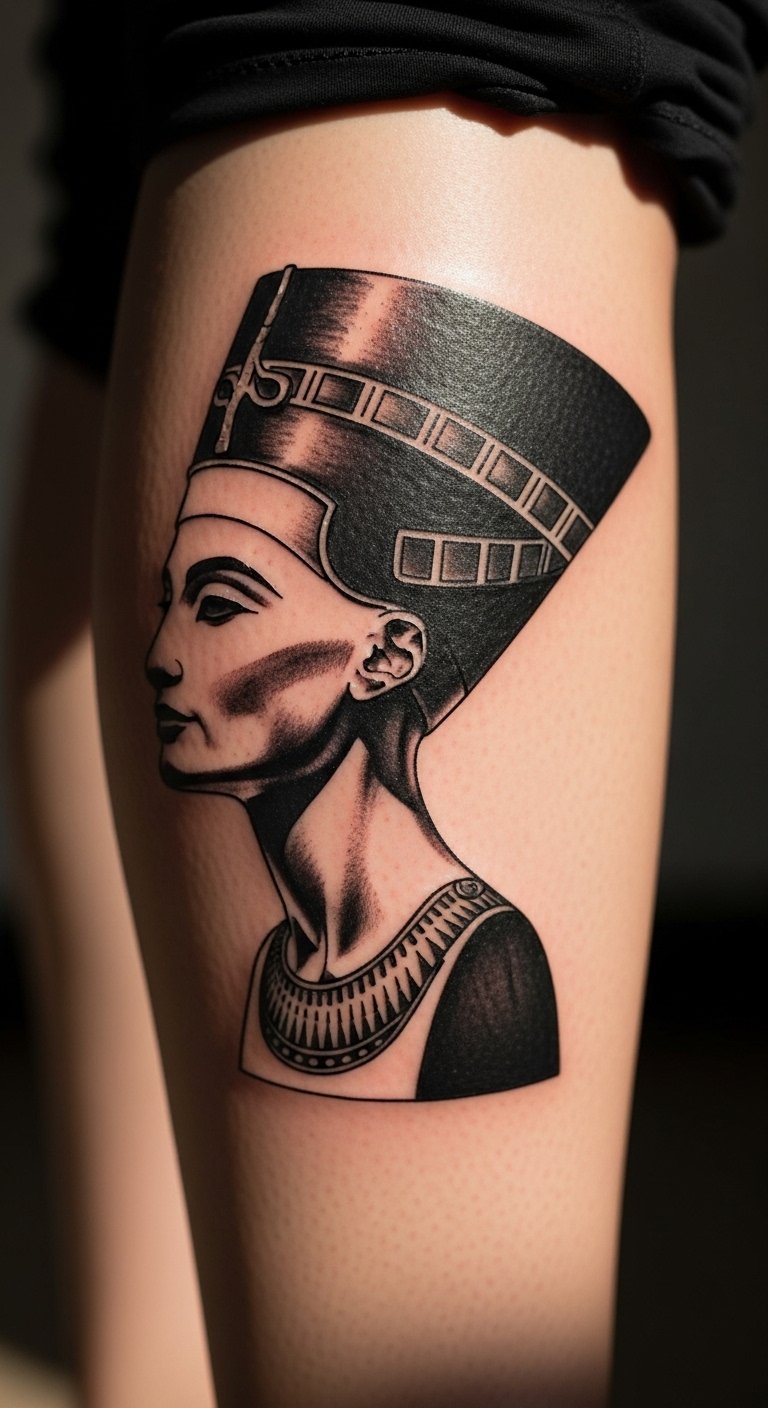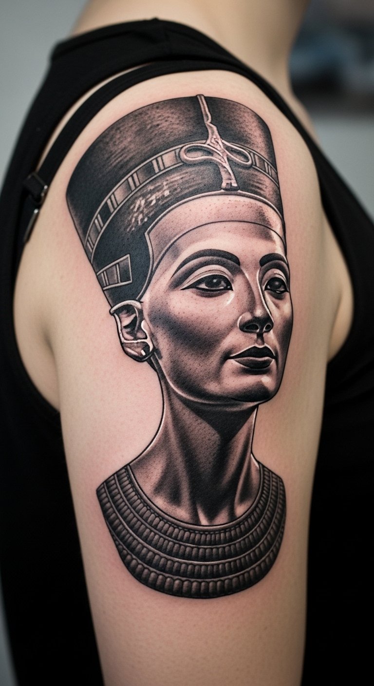 Single needle Nefertiti tattoos offer super fine details. Think tiny dots that build a lifelike face. The eyes and cheeks get soft shades. This fits a smaller budget with shorter sessions. Search for artists who specialize in details. Draw rough ideas with a fine pen. Use free tutorials online to visualize. Place it on your upper arm for balance. Bold this: single needle details pop with care. Clean gently with mild soap. Moisturize with basic cream. Wear breathable shirts to heal. Try marker tests on your skin first. Go for compact designs to save money. Get recommendations from online groups. You achieve realism without high prices.