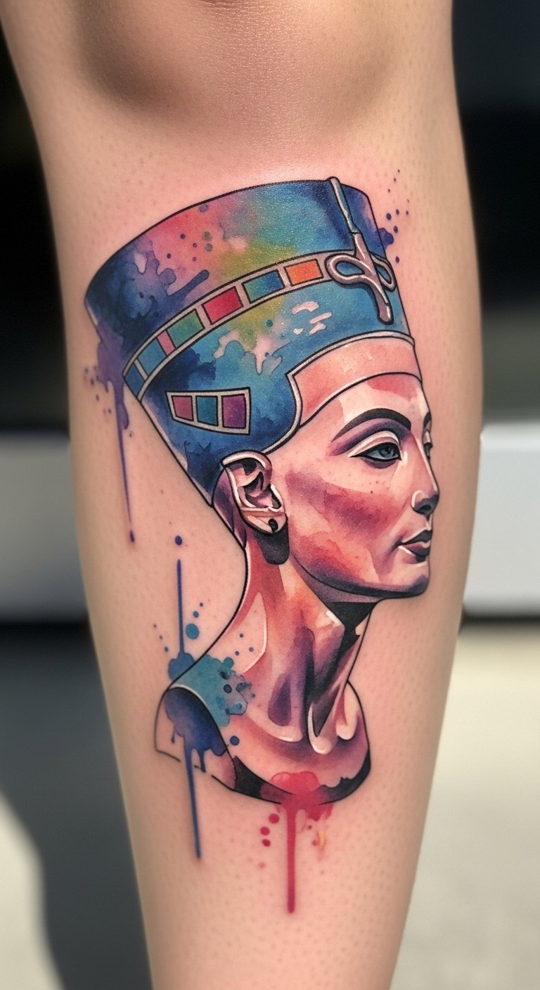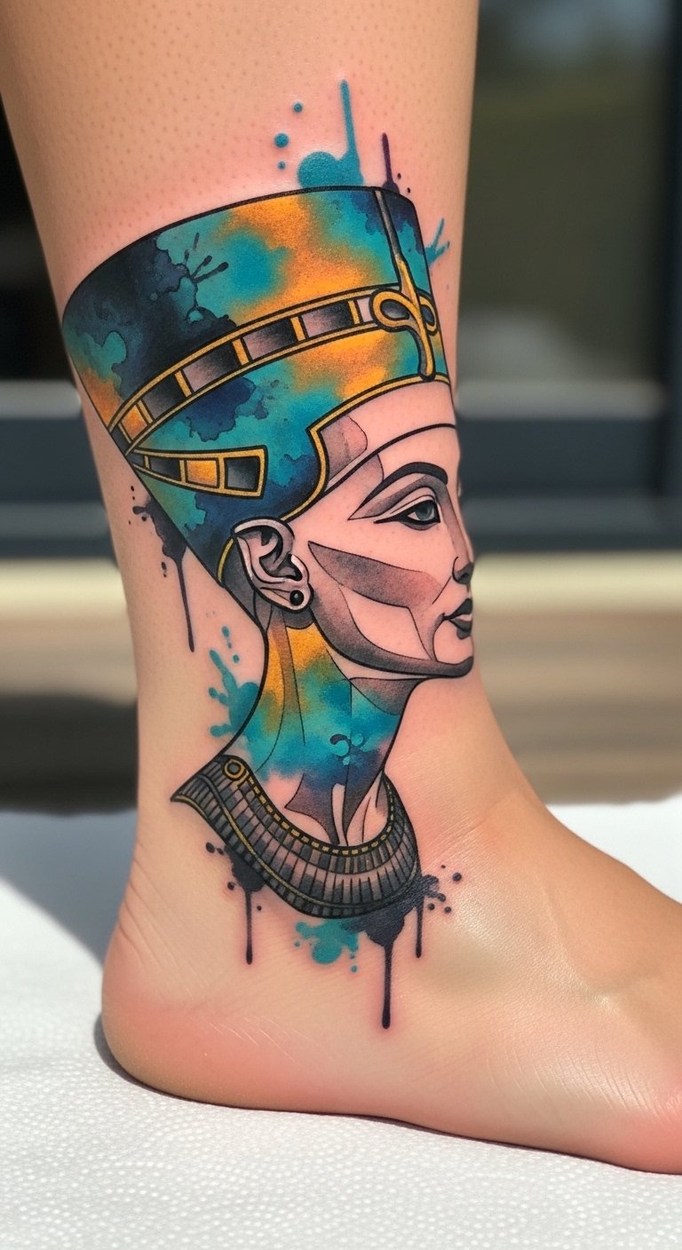 Watercolor and line mix Nefertiti tattoos combine colors and edges. See painted areas with crisp borders. It creates balance. This is cost-effective with mixed techniques. Seek versatile artists. Sketch mixes on paper. Use free blend tools. Place on your ankle. Bold the combo: mixes spark creativity. Clean as needed. Moisturize daily. Match with shoes. Practice with paints. Opt for small blends. Join art forums. You innovate simply.