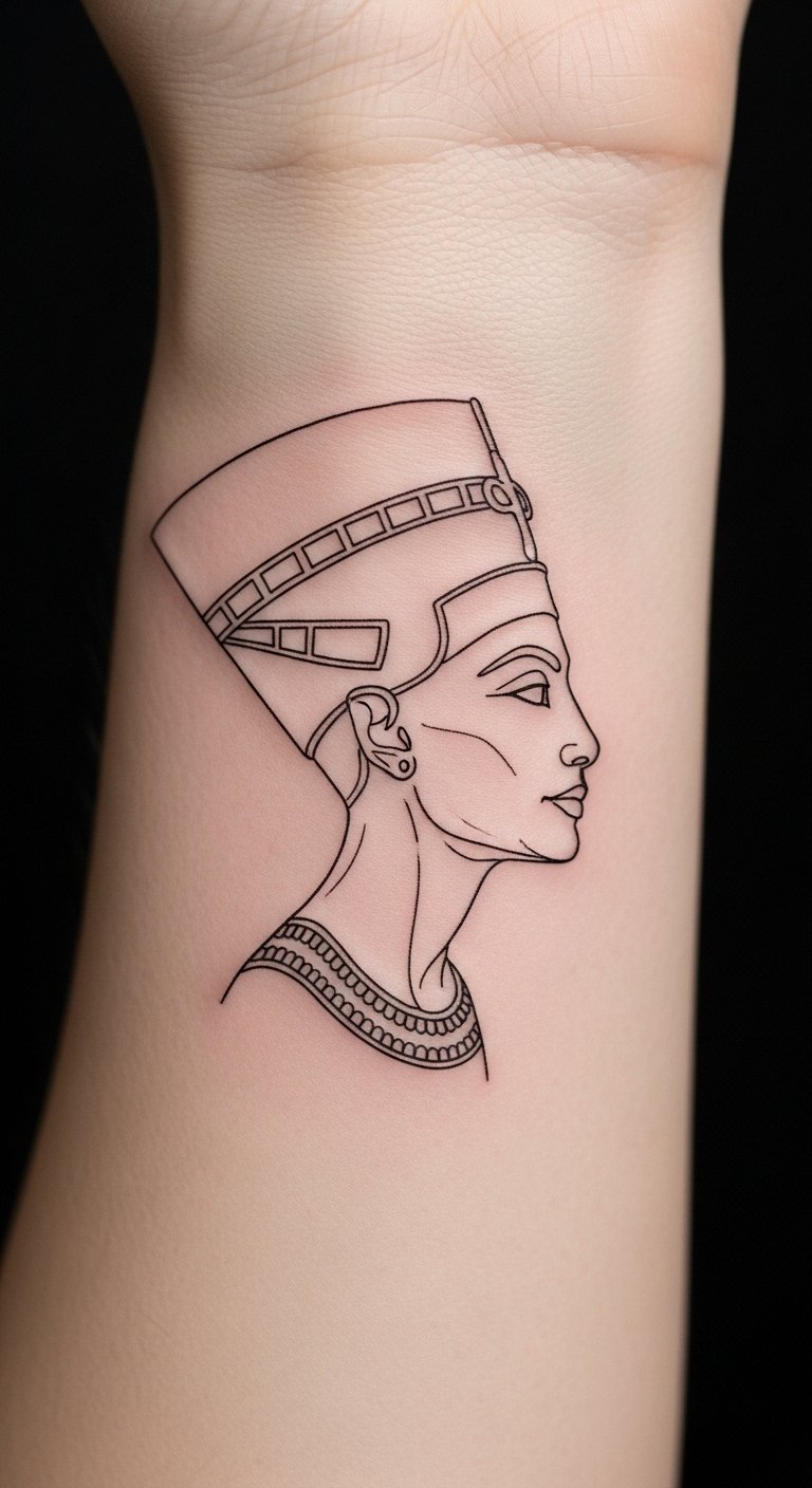 Minimalist linework Nefertiti tattoos focus on clean, thin lines. Imagine a simple outline of the queen’s face and crown. Straight edges make it modern. This option is budget-friendly at under a hundred bucks. Look for artists who do quick line jobs. Sketch your own version on paper with a marker. Use phone apps to adjust sizes. Put it on your wrist for daily visibility. Bold the point: linework heals fast and easy. Dab with alcohol wipes post-session. Apply lotion from your cabinet. Cover with a band-aid during work. Practice with henna kits from the store. Opt for small sizes to keep costs down. Ask friends for affordable artist tips. You get a sleek design without the wait.