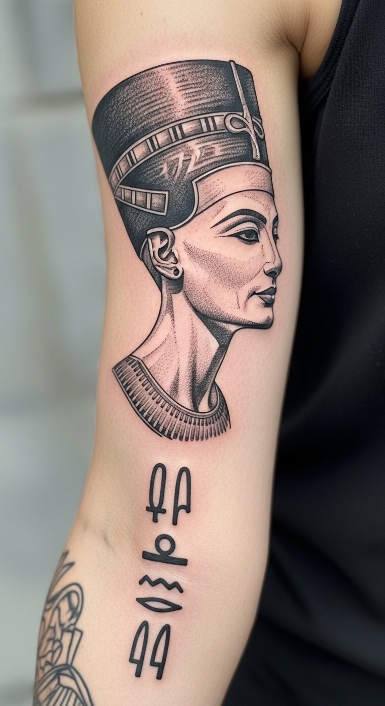 Nefertiti tattoos with hieroglyphics add ancient symbols for extra meaning. Picture the queen’s bust beside simple Egyptian icons. Straight lines connect the elements. This stays affordable with basic ink. Find artists who mix themes easily. Sketch symbols on paper with a pencil. Look at free symbol guides online. Tattoo it on a sleeve for a story. Bold the idea: hieroglyphics deepen the tale. Wipe with clean cloths after. Use everyday lotion for maintenance. Pair with cultural books for inspiration. Practice drawing symbols with kids’ sets. Keep the design modest to cut costs. Share ideas in community forums. You create a narrative without extras.