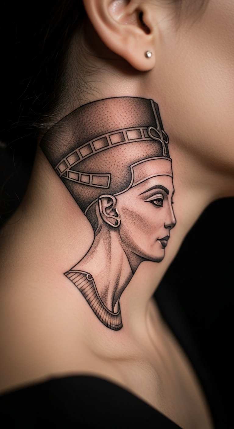 Neck Nefertiti tattoos place the queen high for bold impact. Imagine a profile curving with your skin. Fine lines keep it elegant. This is a low-cost spot for quick work. Choose artists good with sensitive areas. Draw templates on your neck with washable markers. Use mirrors to plan views. Position it for daily glances. Bold this: neck spots show confidence. Clean with gentle wipes. Moisturize with home products. Cover with scarves if needed. Test with stick-on tattoos. Opt for small versions to save. Ask for quick session deals. You wear history proudly.