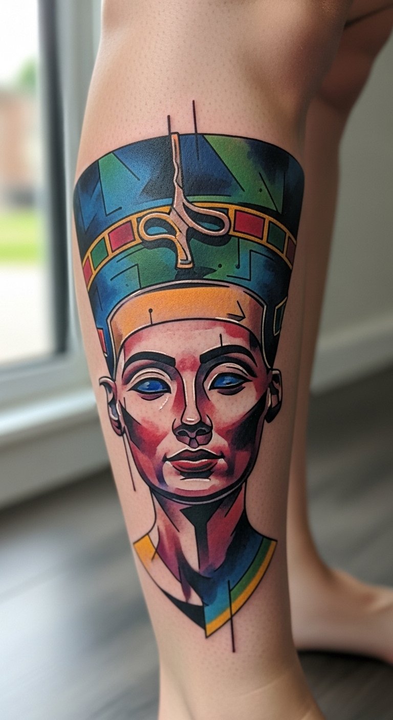 Abstract crown Nefertiti tattoos use colors for a modern twist. Picture geometric shapes around the crown. Bright hues mix playfully. This is wallet-friendly with creative inks. Seek artists who blend styles. Draw abstracts with colored markers. Explore free art apps. Tattoo on your leg for fun. Bold this: abstract adds flair quickly. Clean with basic supplies. Moisturize daily. Match with colorful outfits. Use stickers to preview. Choose small areas to save. Join online art chats. You get unique vibes easily.