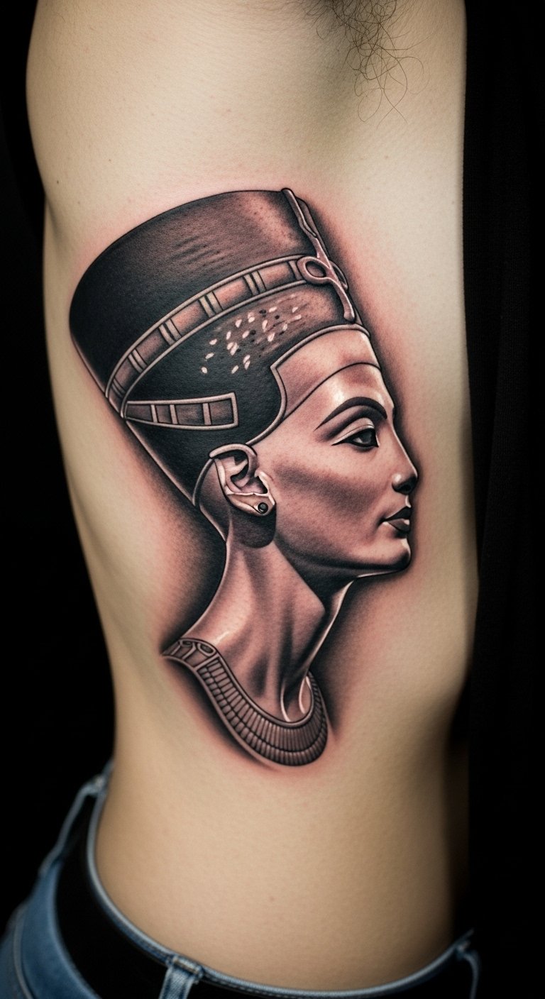 Rib Nefertiti tattoos take cues from stars like in pop culture. See a sleek profile along your side. Shading fits the body. This keeps costs down with focused work. Find artists who do rib specials. Sketch on your side with safe markers. Watch free inspiration videos. Place it for personal views. Bold the style: rib ink feels intimate. Gently clean the area. Use home creams. Wear loose tops. Test with body paint. Go for quick designs. Share celebrity looks online. You channel icons affordably.
