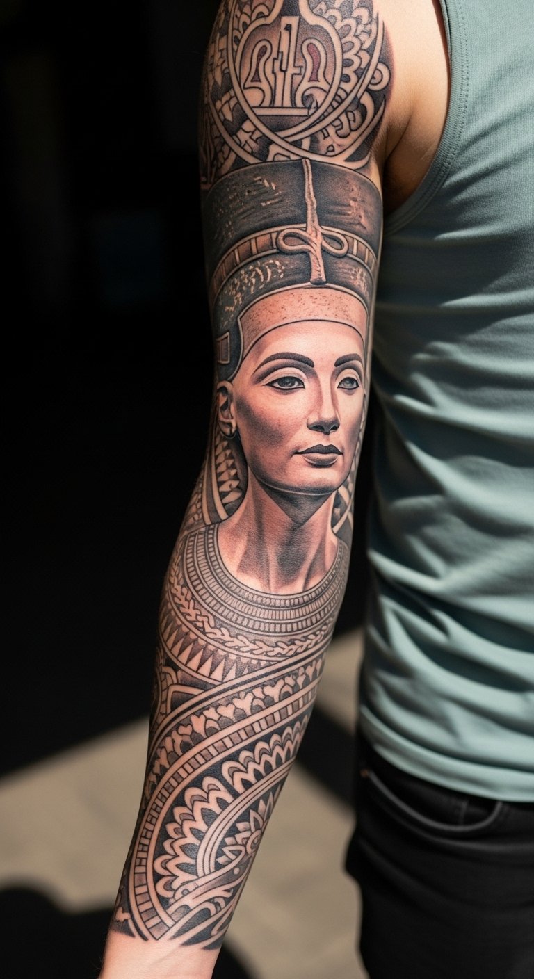 Sleeve Nefertiti tattoos incorporate Egyptian elements for a full story. Think symbols wrapping your arm. Details flow seamlessly. This can be phased in to save money. Find artists who build sleeves gradually. Sketch sections on paper. Gather free motif ideas. Design for your arm length. Bold the flow: sleeves tell a journey. Clean each part. Use basic lotions. Roll up sleeves to air. Start with temporary wraps. Break into sessions. Connect with tattoo communities. You create epics over time.