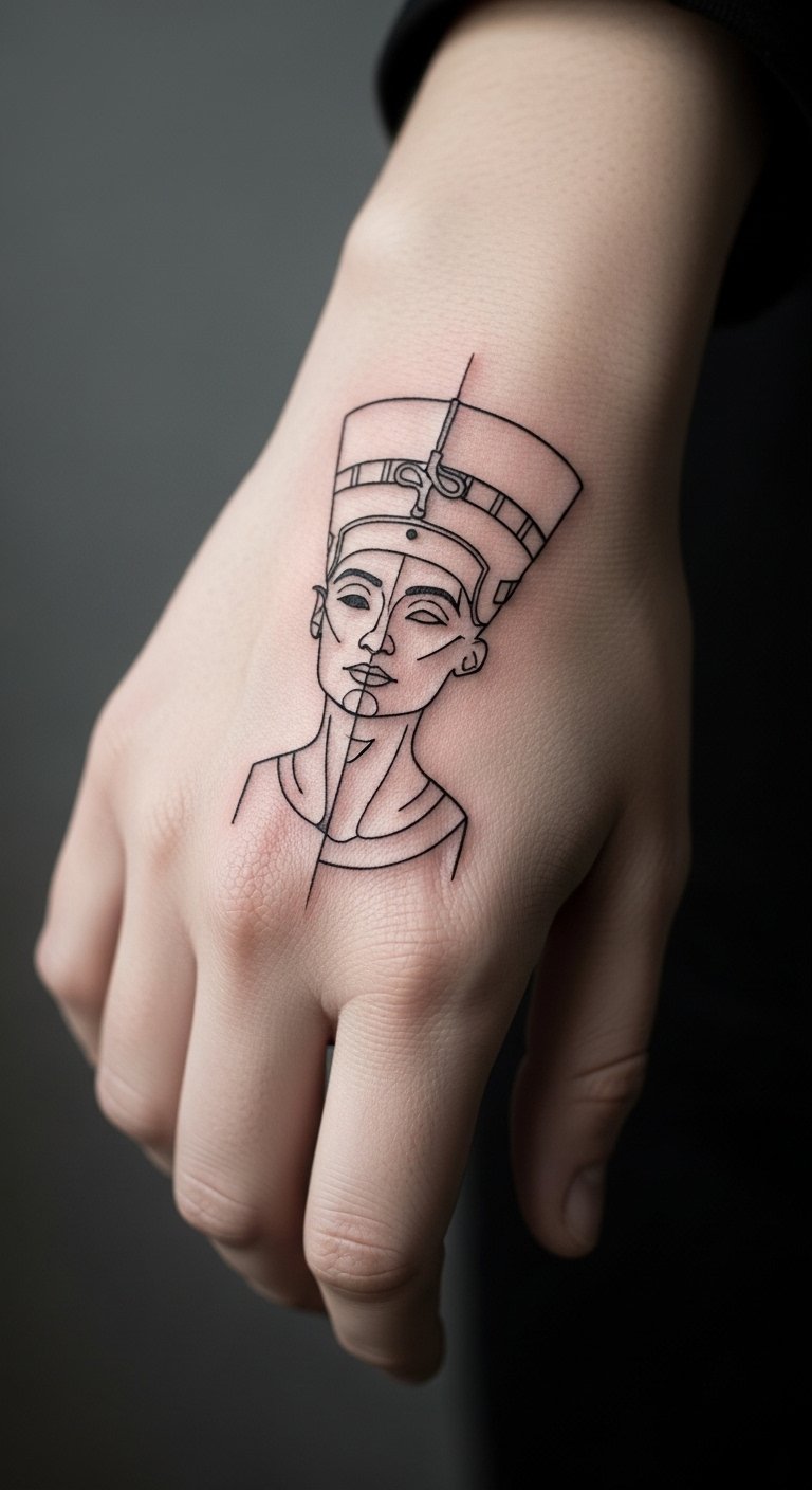 Modern minimalist Nefertiti tattoos mix simple lines with fresh ideas. See abstract adds to the outline. It keeps things current. This is cheap with basic lines. Look for modern ink pros. Sketch twists on paper. Use free modern apps. Tattoo on your hand. Bold the mix: minimalist evolves style. Wipe with care. Apply daily creams. Show with rings. Practice with simple draws. Keep it tiny. Join trend groups. You update tradition.