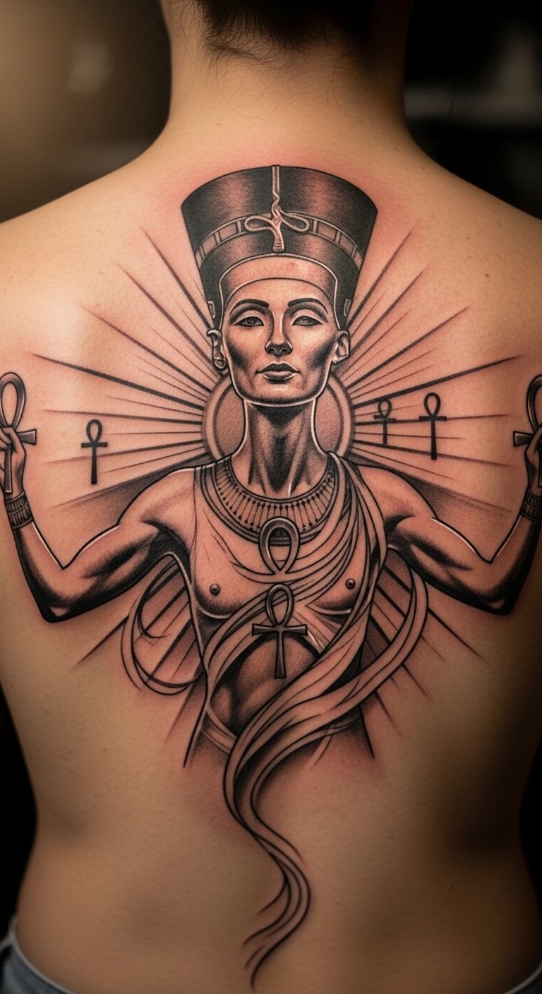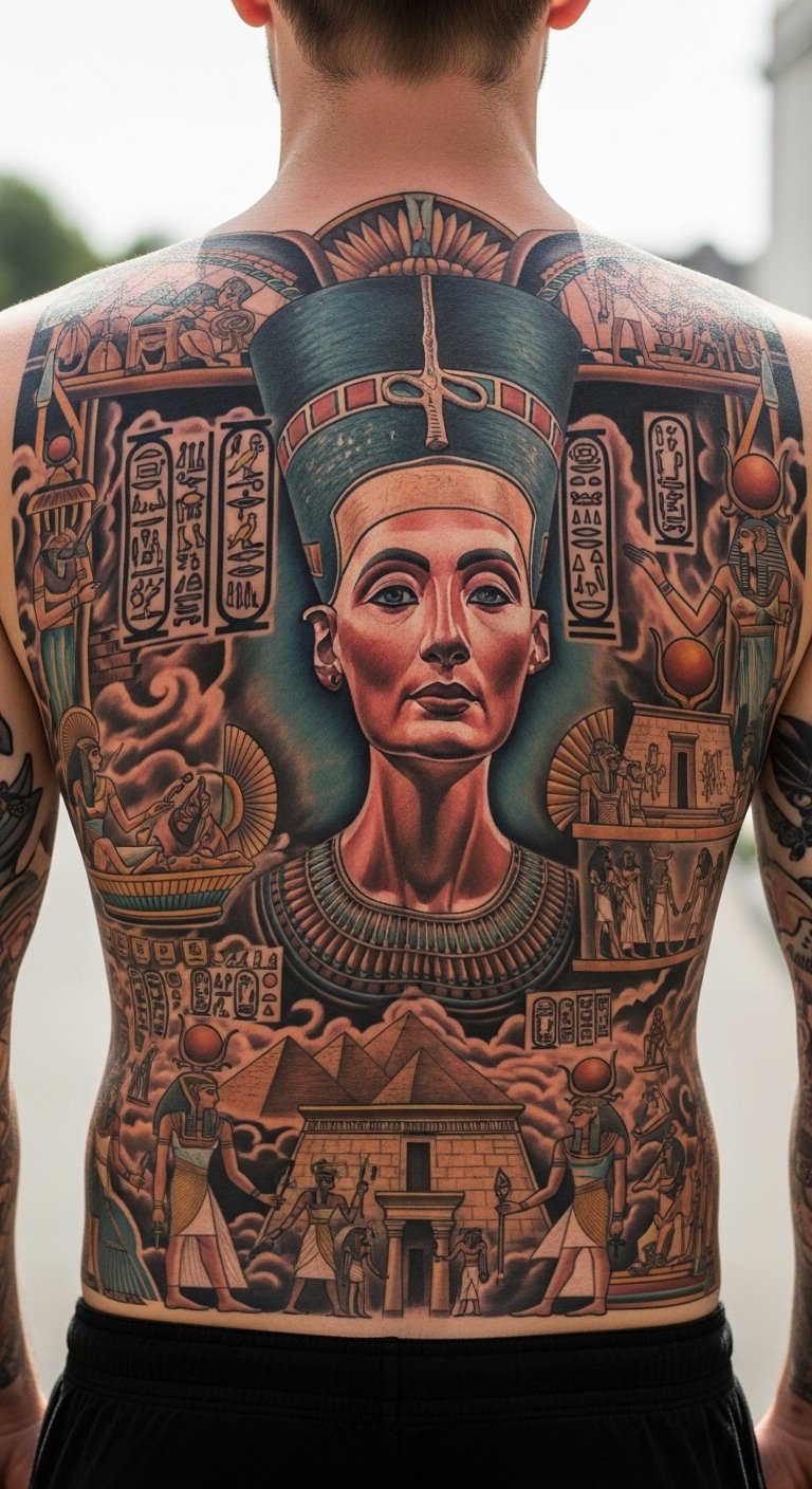 Full back Nefertiti scene tattoos create a grand view. Think the queen in a bigger setup. Details fill the space. This builds over time to save. Seek scene pros. Sketch scenes gradually. Find free back ideas. Design for your back. Bold the scale: backs hold stories. Clean sections. Use lotions regularly. Uncover for air. Start small. Phase in work. Connect with others. You tell tales fully.