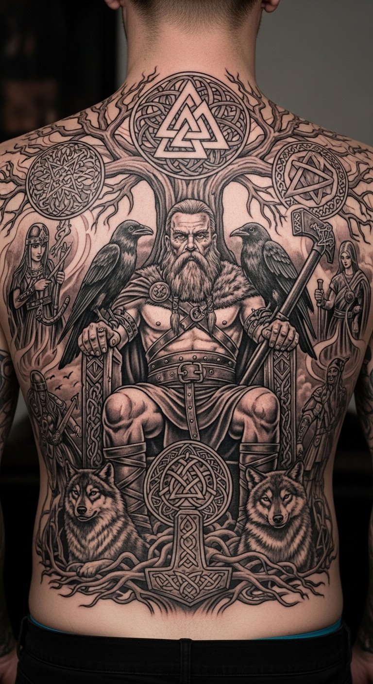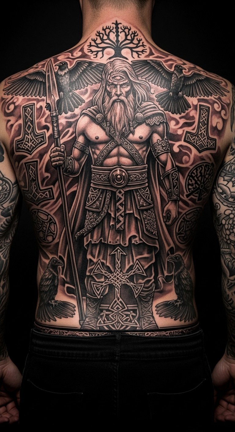 A back Odin tattoo shows full commitment. It embodies leadership and fights. Make it your canvas.