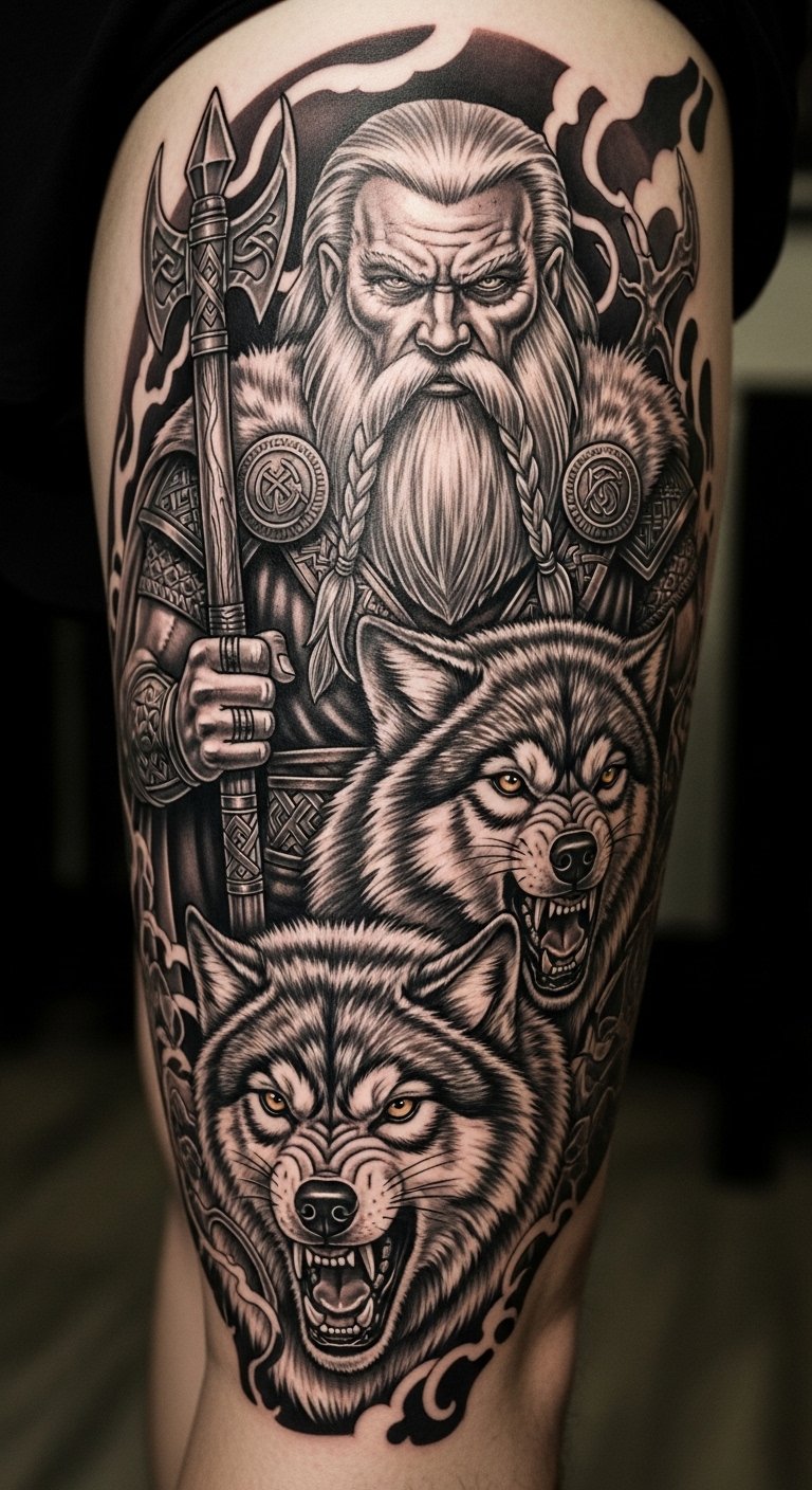 Wolves with Odin speak of loyalty and wild spirit. They represent your pack. Ink it for bonds.