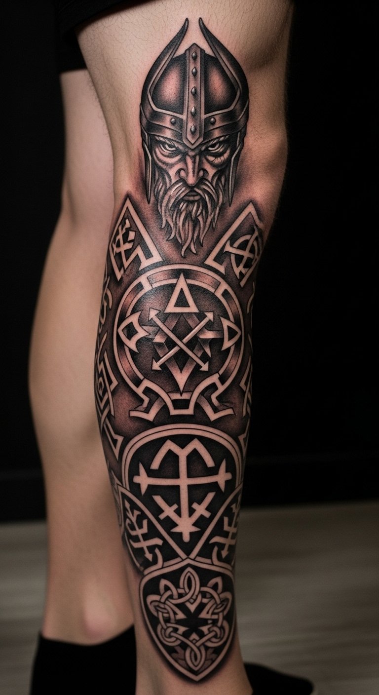A leg Odin sleeve tells a walking story. It stands for journey and growth. Build it over time.