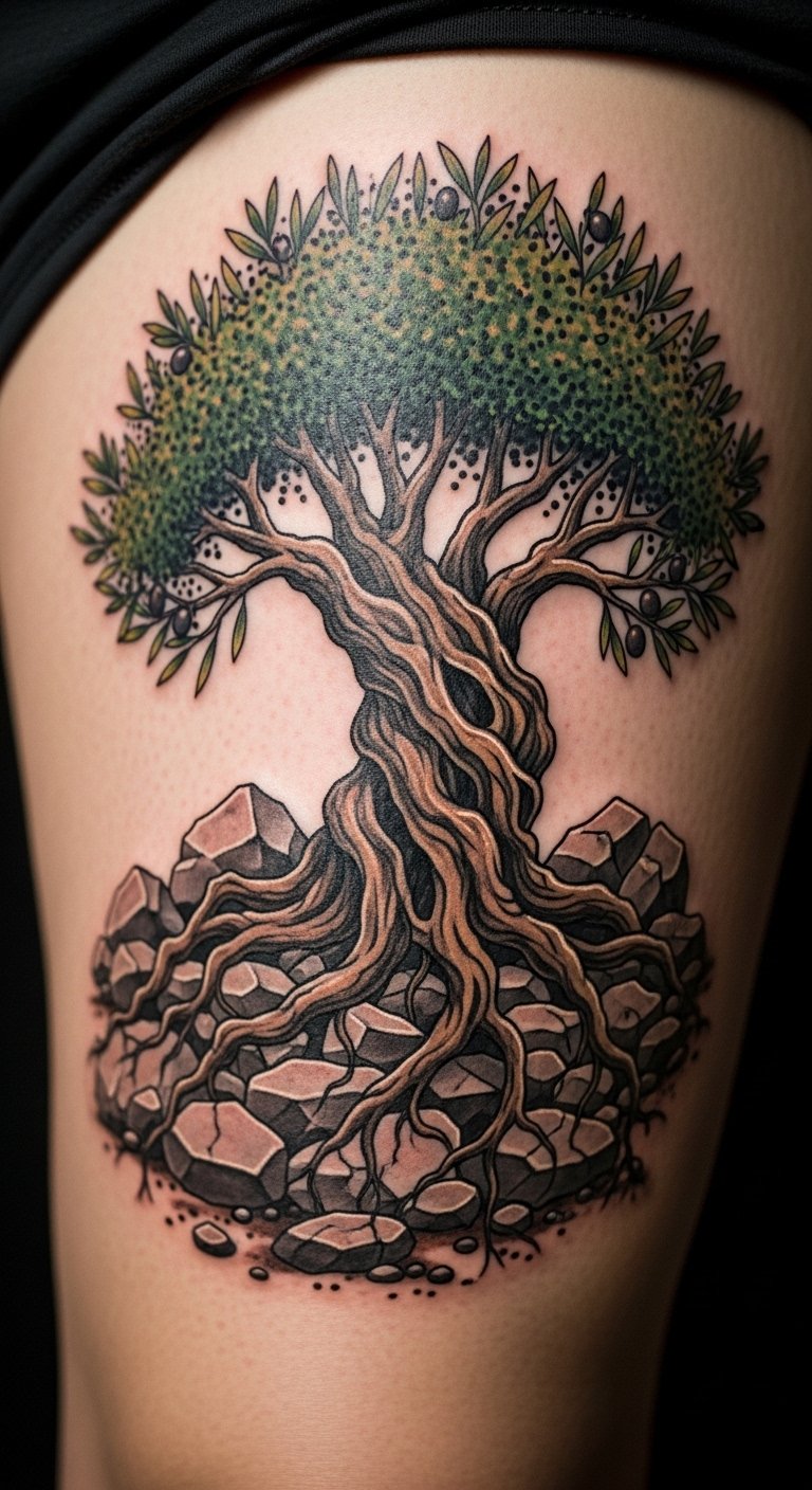 Think of an olive tree pushing through rocks, showing toughness and survival. It’s about overcoming tough times.