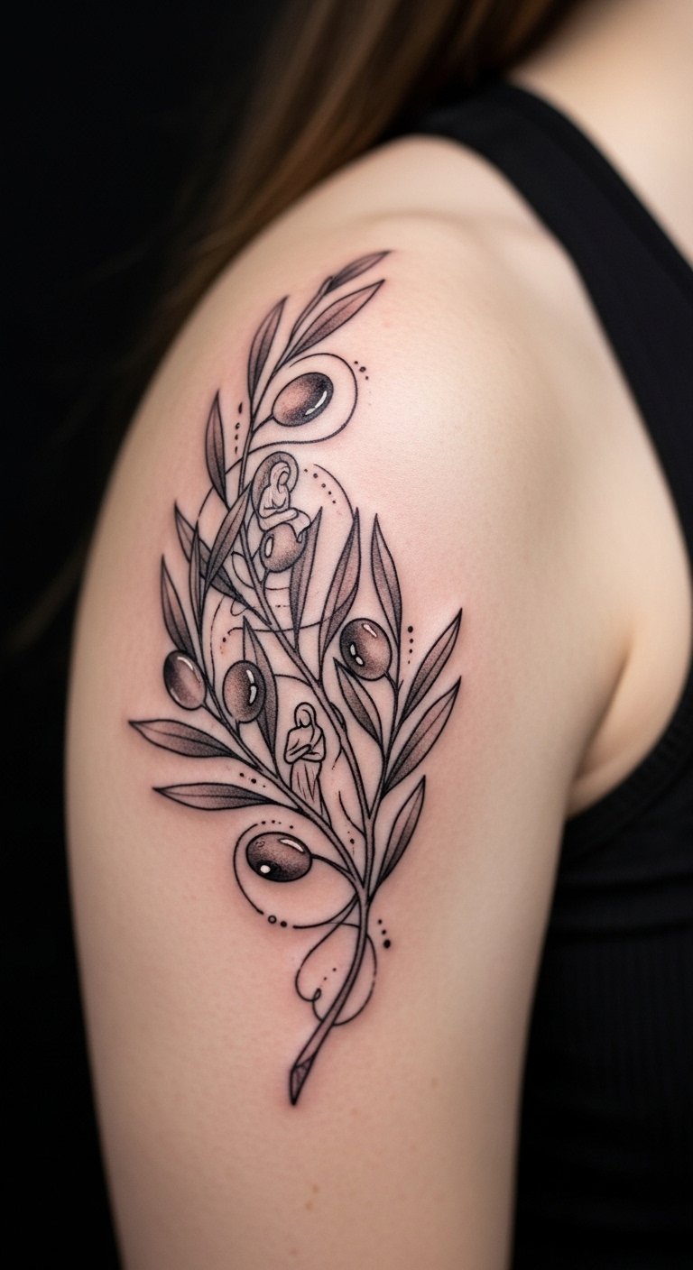 Picture olive branches weaving into family symbols, like linked hands, for heritage and bonds.