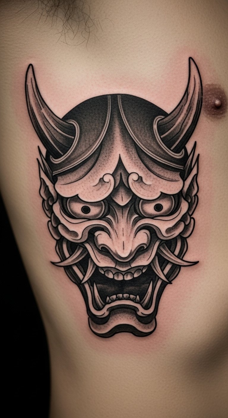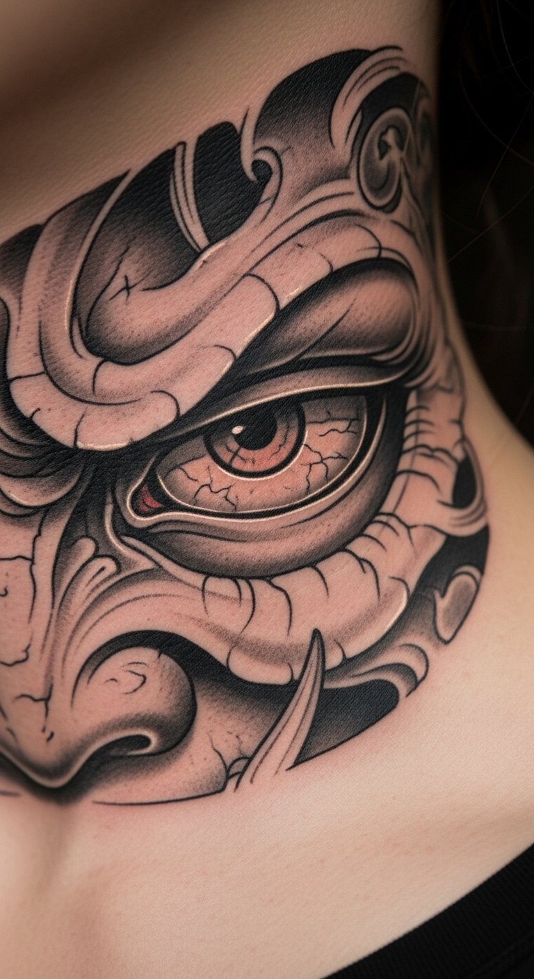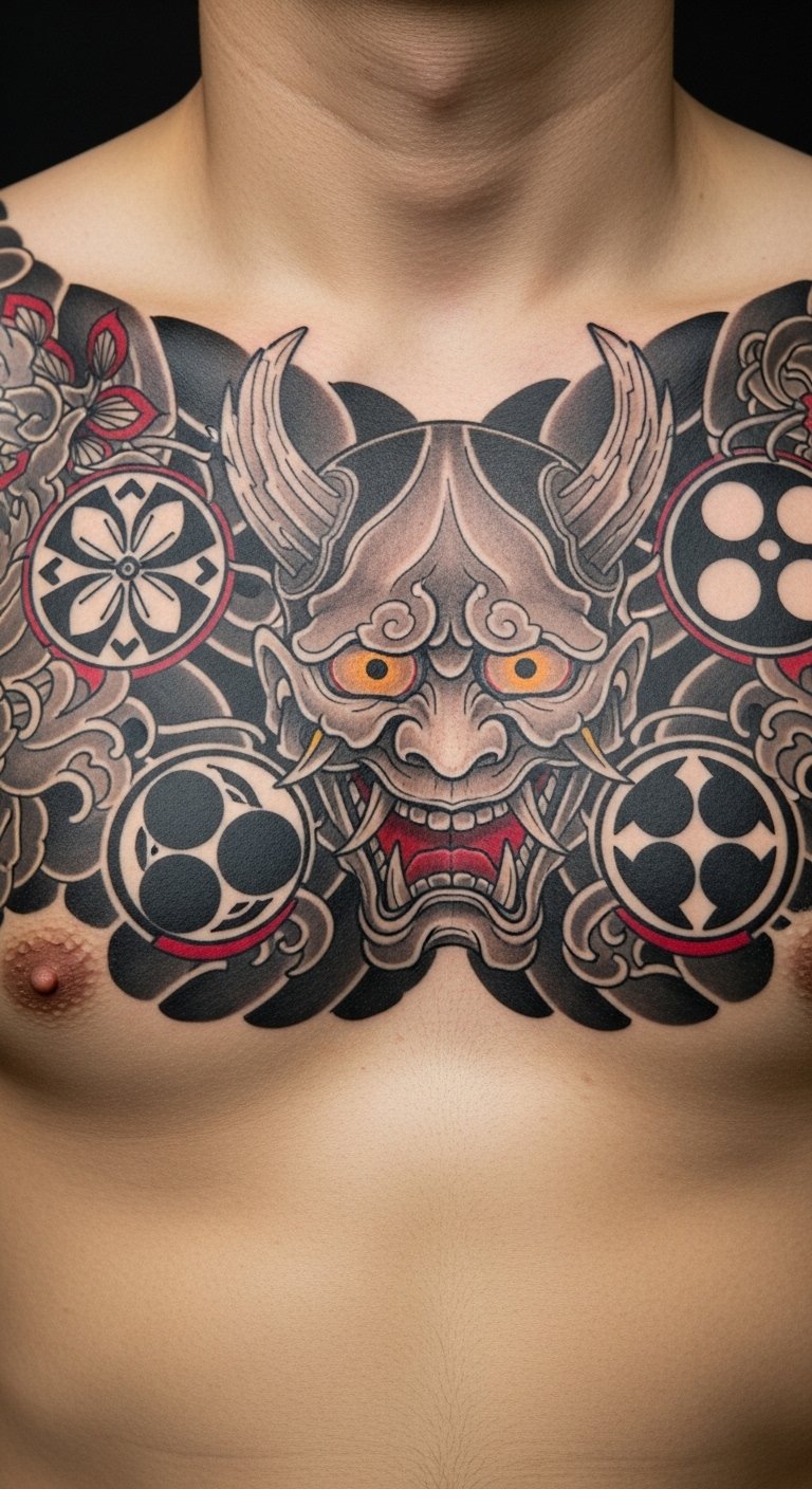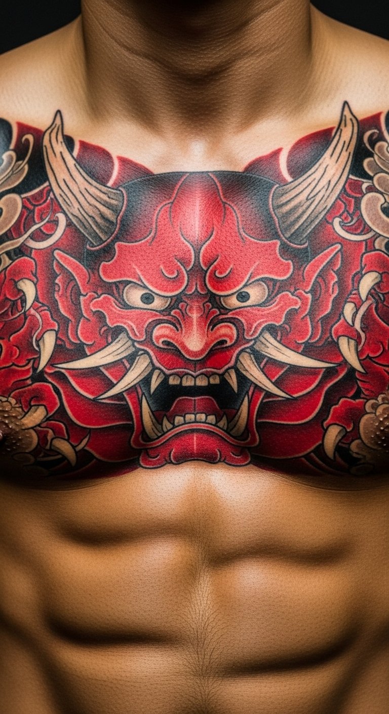 A fierce Oni face brings out the warrior in you. Sharp teeth and eyes make it intense. Doodle on scrap paper to brainstorm. Everyday pens work fine. Look for beginner artists with low rates. Bold the teeth for focus. Position it on your chest. Try face stickers as practice. Find flash day events for savings. It’s all about that strong look.