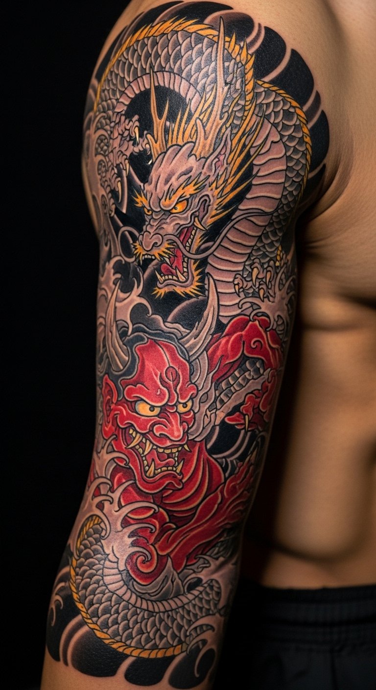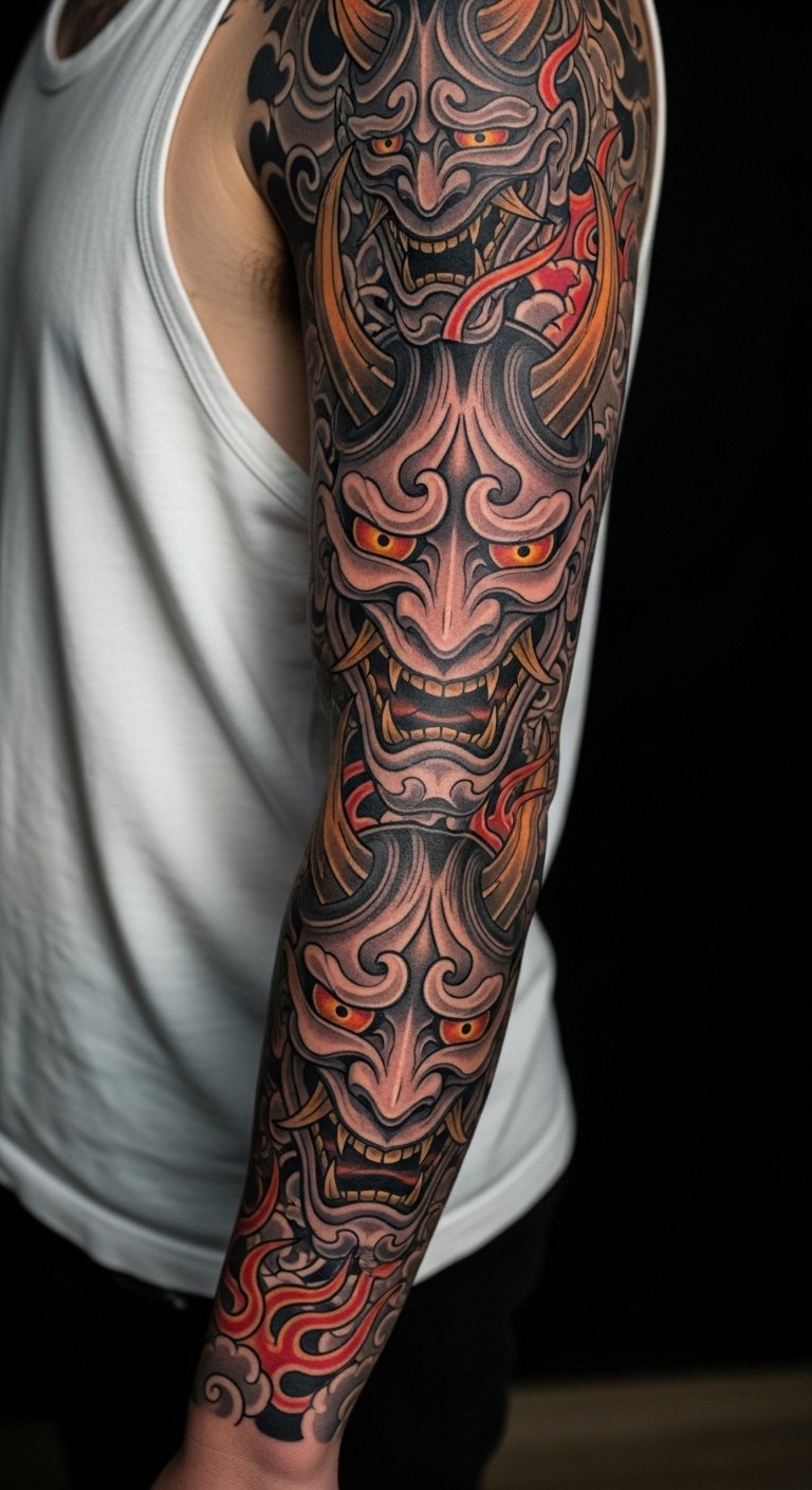 Go big with an Oni arm sleeve. It covers the arm in demon themes. Break it down into smaller sketches first. Use free apps for layout. Shop around for package deals. Bold the main demon in plans. Build it over time to save. Start with a single piece. Local studios often have plans. This makes a statement piece.