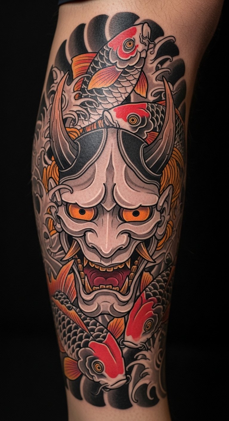 Oni and koi fish mix power with flow. The fish add movement and luck. Sketch both on a simple pad. Free online images help. Find combined designs at low cost. Bold the fish scales. Put it on your leg. Practice with temporary options. Look for artist bundles. This blend shows balance.