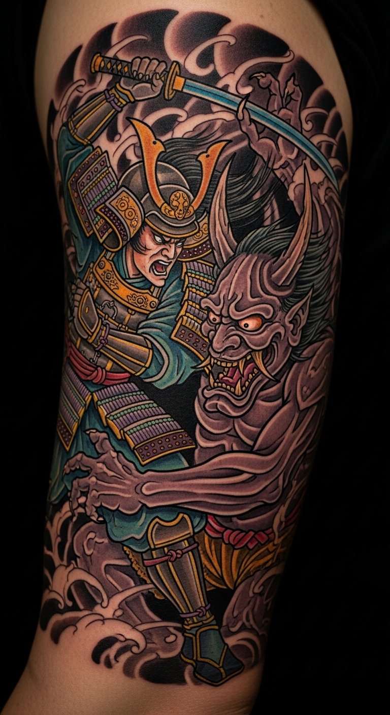 Samurai and Oni mix honor and fight. Show a battle scene. Plan with quick sketches. Everyday items work. Look for warrior tattoos cheap. Bold the sword. Put it on your arm. Use action figures for ideas. Catch combat sales. It’s epic and strong.