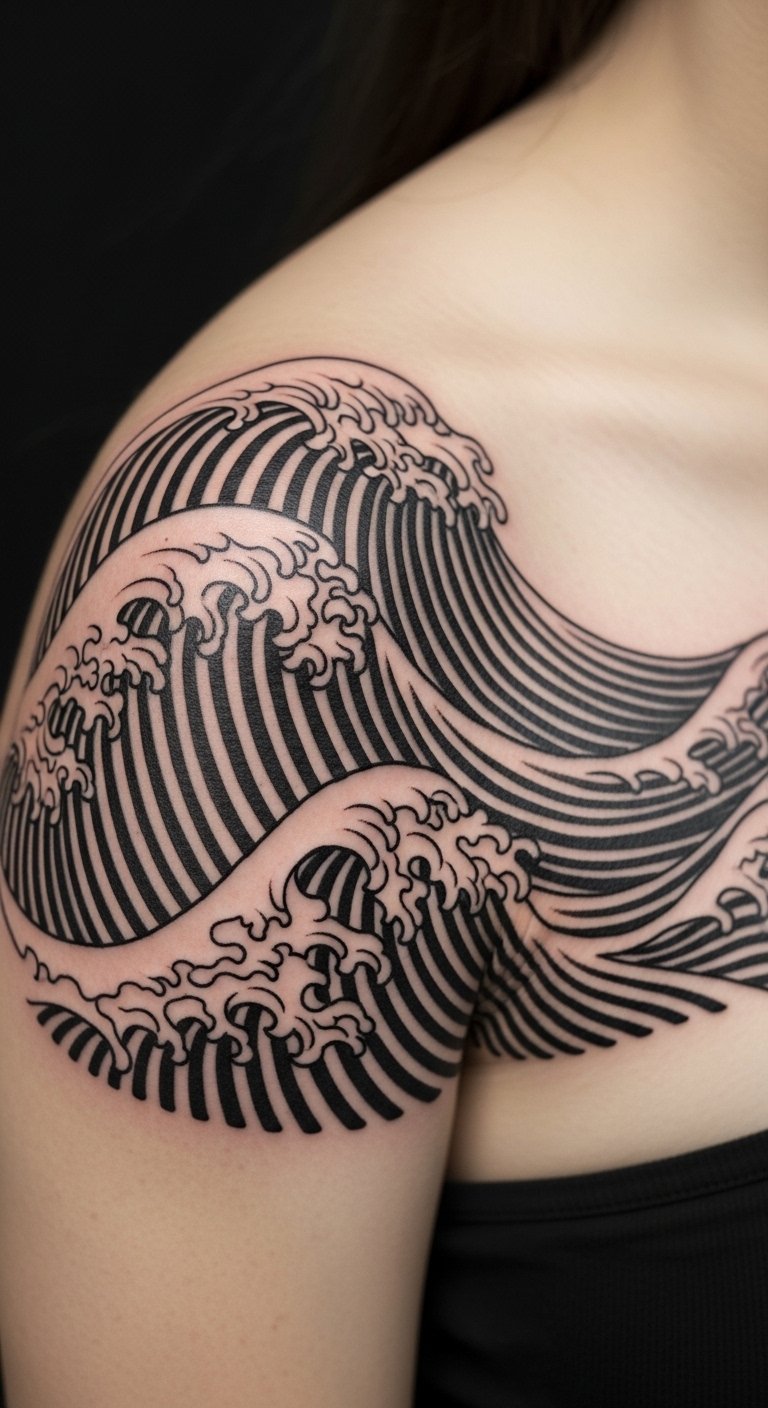 Imagine waves that seem to move on your skin. Draw it out with a ruler and pencil on paper for a quick plan. This costs nothing and helps you tweak shapes. Choose your shoulder for a spot that hides easily under clothes. Stick to black ink for budget savings—it’s straightforward and fades less. Make it your own by adding small waves based on your favorite patterns. If you’re handy, use washable markers to practice on your body first. Artists often have affordable options for smaller designs like this. The key is symmetry, so align it with your body’s natural flow. Heals fast with basic care like moisturizer from your bathroom. Wear it proud to jazz up tees or dresses.