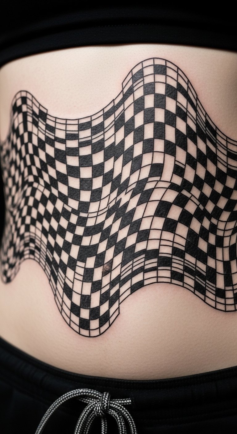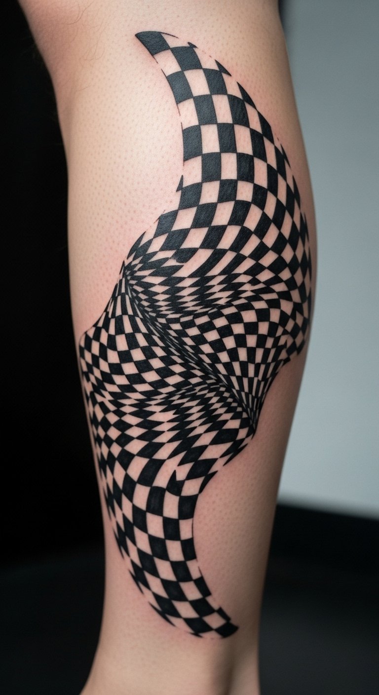 Think of a checkerboard that plays tricks on the eye. Sketch it freehand on paper using a grid for accuracy—grab graph paper from a dollar store. Place it on your calf for easy coverage with pants. Black and white keeps things cheap and classic. Customize by varying square sizes to match your leg’s shape. Test with body paint or stickers you already own. Artists might offer deals for simple patterns, so shop around. This design fools the eye with just ink, making your leg look alive. Care tip: use gentle soap from home to keep it fresh. Pair it with sneakers for a cool vibe that doesn’t break the bank.
