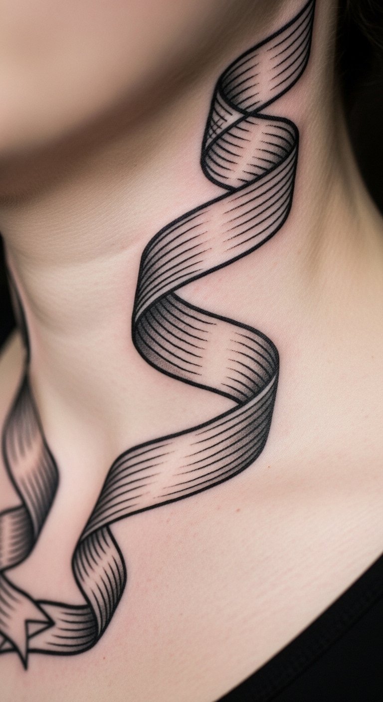 Ribbons that twist on your neck. Ribbon drawings on paper help plan it. Necks offer bold, visible spots. Black lines keep it economical. Make them follow your neck’s curve. Use ribbons as body tracers. Artists do these quickly and cheaply. The twist adds motion easily. Heal with daily routines. Accessorize with collars.