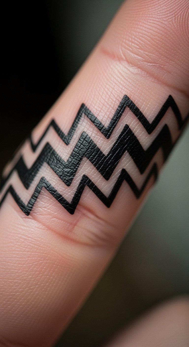 Zigzags that energize your finger. Draw zigzags on paper quickly. Fingers are for subtle touches. Black effects are inexpensive. Tailor to finger length. Practice with nail art tools. Artists offer low prices for tiny tattoos. The energy pops with lines. Care with hand creams. Wear rings over it.