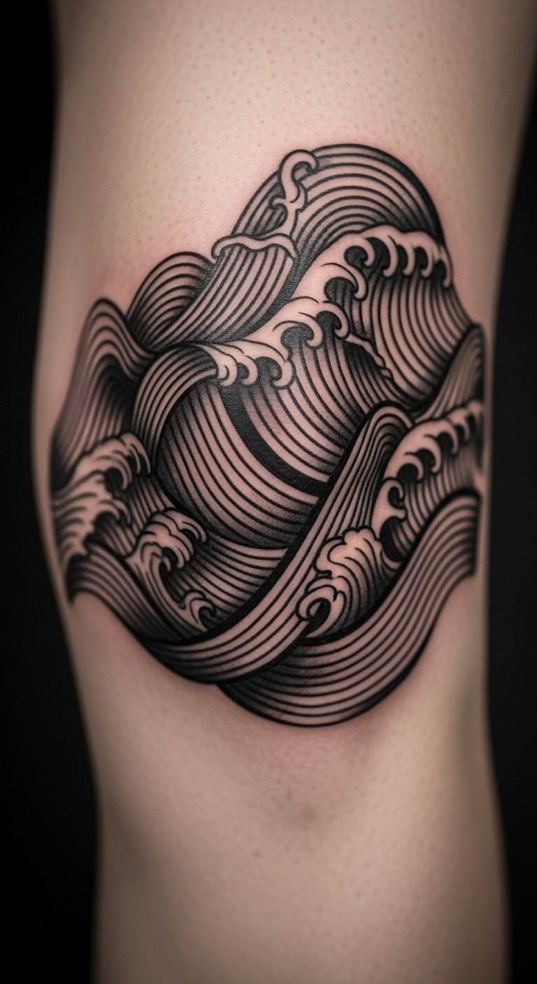 Waves that harmonize on your knee. Wave drawings on paper are simple. Knees work for active folks. Black waves keep costs low. Fit to knee contours. Try with wave stickers. Artists price these reasonably. The flow feels natural. Use knee guards for care. Match with active wear.
