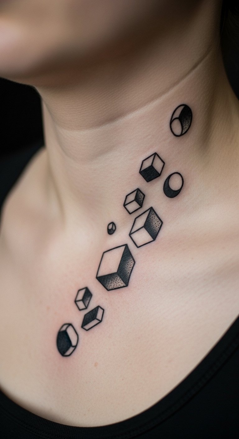Shapes that float on your collarbone. Shape cutouts on paper aid planning. Collarbones are elegant spots. Black shapes keep it simple. Personalize to bone curve. Test with shape stickers. Find artist deals for bones. The lightness lifts looks. Heal with neck care. Layer with necklaces.