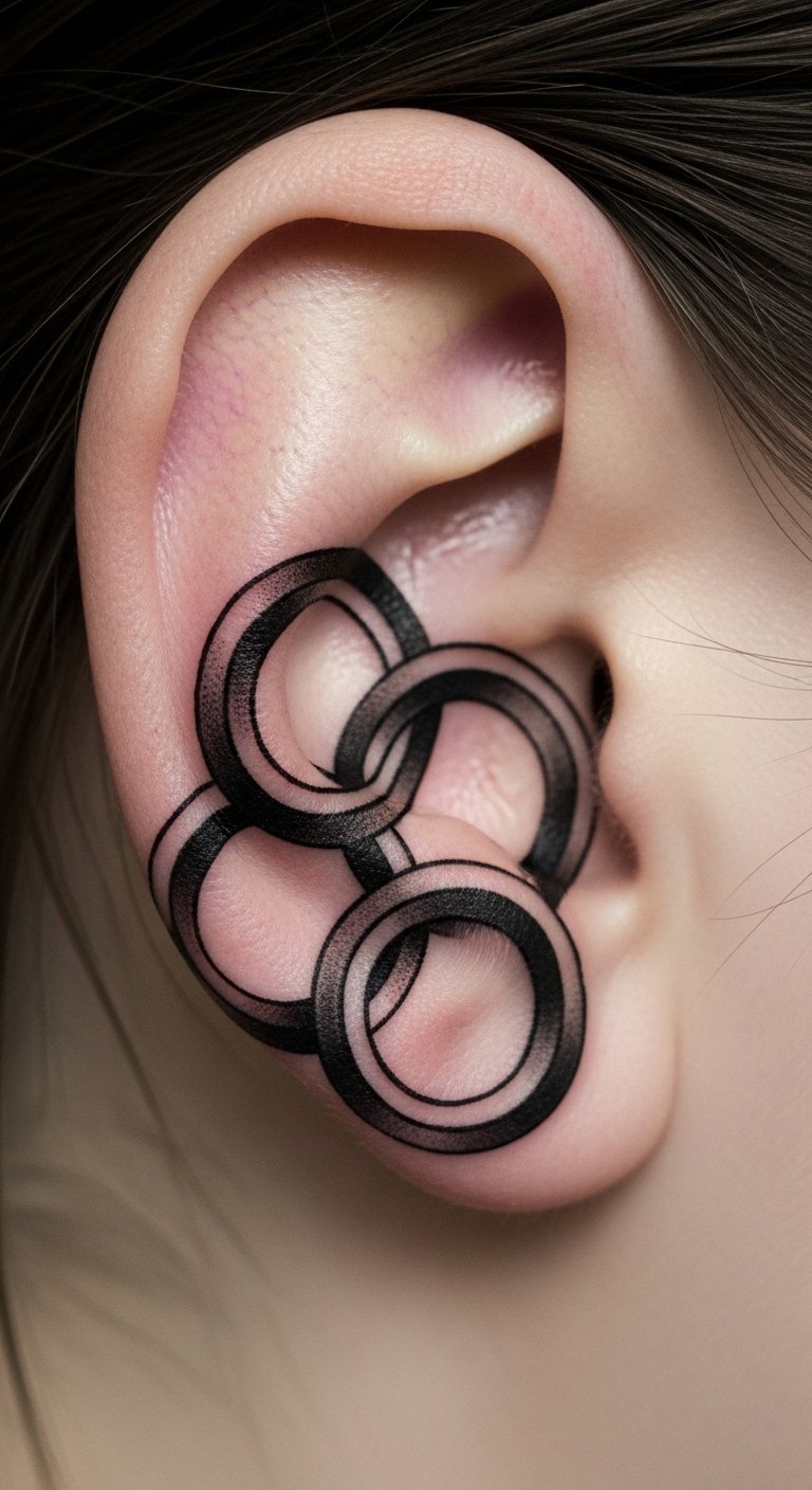 Rings that interlock on your ear. Ring sketches on paper are straightforward. Ears are for delicate touches. Black rings are inexpensive. Adjust for ear shape. Test with ear jewelry. Artists do ears cheaply. The connection feels linked. Care with ear drops. Pair with earrings.