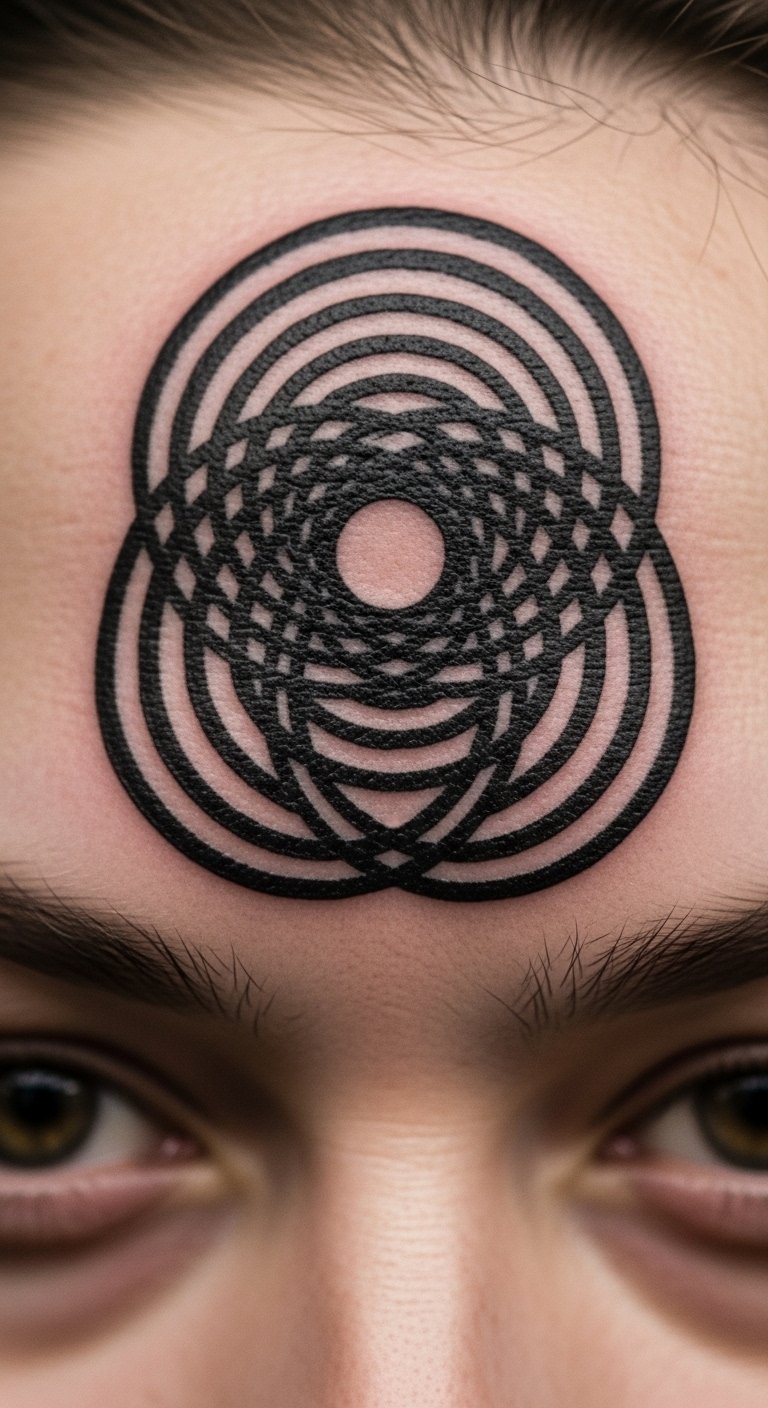 Circles that overlap on your forehead. Circle overlaps on paper plan it. Foreheads are bold choices. Black circles are cheap. Customize to forehead space. Test with circle stickers. Artists offer forehead options. The layers add depth. Care with forehead oils. Cover with hats.