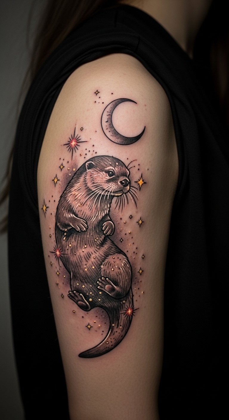 See an otter with stars and a moon. This adds a dreamy feel. It’s great for your upper arm. Draw stars around a simple otter shape. Use star stickers as guides. For cheap options, search free celestial templates online. Local shops might do this for $70 or less. Use glow-in-the-dark markers for fun tests. Place it where you can cover it if needed. This design looks nice in shades that match your skin. Try silver ink for a twist. Practice on fabric with fabric pens. It’s an easy way to experiment.