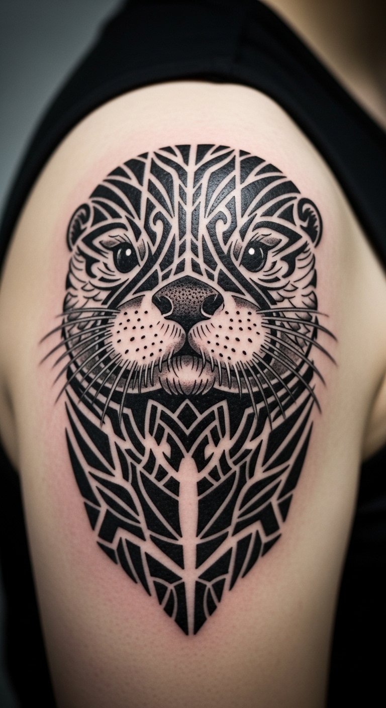 Consider a tribal otter face. It uses bold patterns for a strong look. Try it on your shoulder. Sketch geometric shapes over an otter face. Use a ruler for straight lines. Find budget deals on tribal art sites. Some tattoos cost just $60. Add your patterns with tape as a guide. Test with stick-on tattoos from the store. They help you decide. Black ink works everywhere. Keep lines thick for better visibility. Draw on paper first to get it right.