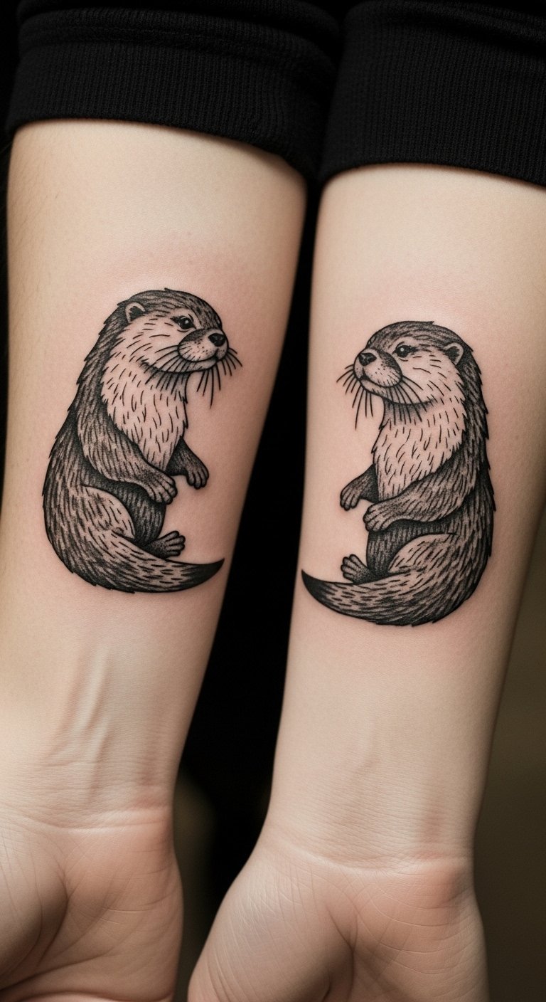 Think of two otters for you and your partner. This shows connection. Place them on wrists. Draw matching sketches together. Use shared apps for ideas. Look for couple deals at tattoo places, often under $100 total. Customize with a heart link. Try paper cutouts to plan. Buy couple temporary tattoos online for pennies. See how they align. This design fits any skin with simple colors. Make it special with a date added.