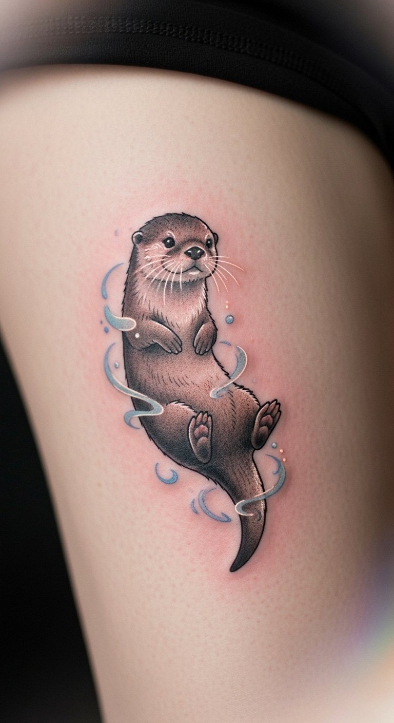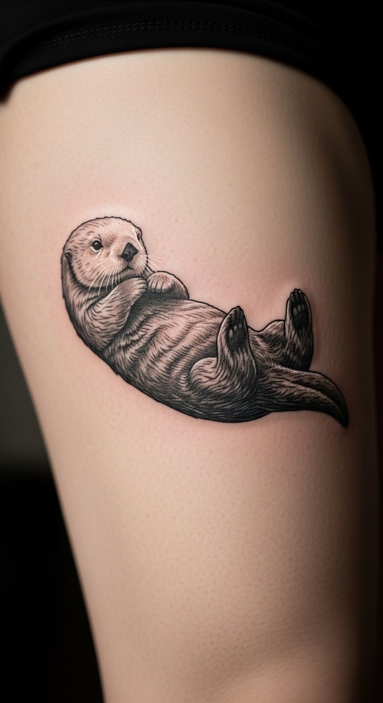 A relaxed floating otter. It feels peaceful. Put it on your thigh. Sketch a floating shape. Use free sea animal prints. Artists do this cheaply. Test with floating toys as inspiration. This pose fits various skin. Keep it light.