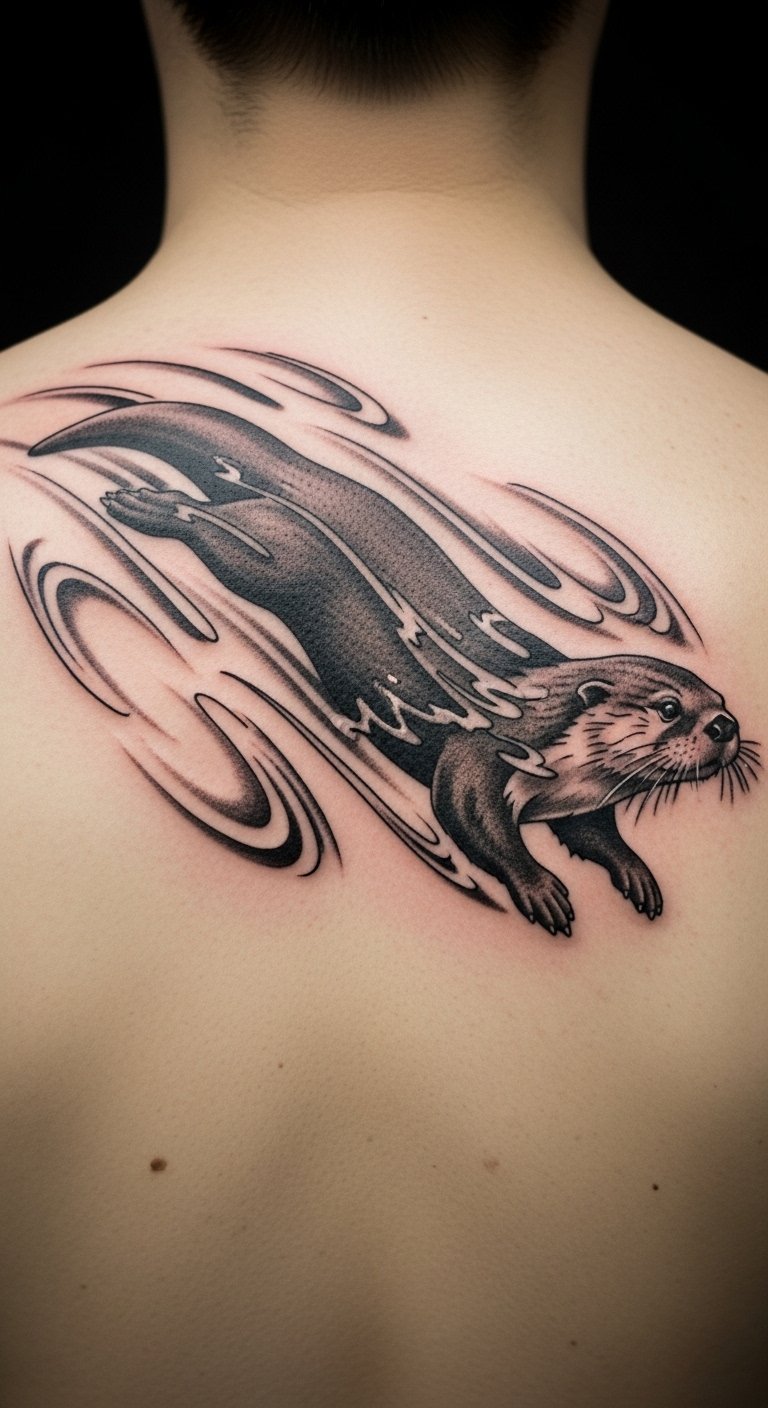 Imagine an otter swimming fast. Add splashes for extra action. This makes your tattoo feel alive. Put it on your forearm to show off. Sketch the otter with waves around it. Use pens from your desk. Save money by finding free design apps on your phone. Many artists offer this for around $80. Keep details minimal to cut costs. Draw bubbles with a dot tool at home. Test with henna kits, which cost little. They let you try without pain. This style suits all skin shades with the right ink. Bold lines help it stand out. Get a friend to help with your sketch practice.