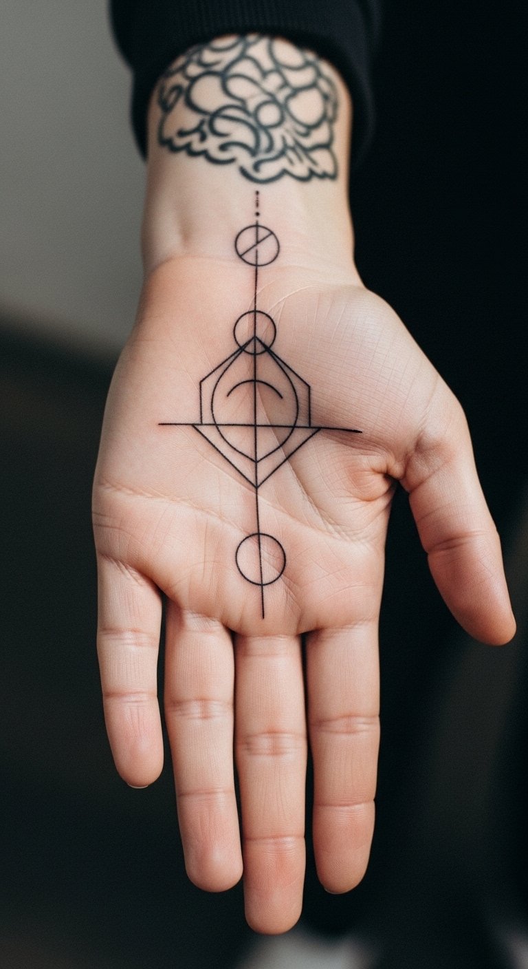 Geometric designs keep things simple and striking on your palm. Think triangles or circles that form a pattern. These shapes hold up well against fading. Start with a sketch on paper to see how it looks. Use free apps like Procreate to draw ideas at home. Pick a local artist who does hand work for under $100. Bold lines make the tattoo pop. Keep daily routines in mind, like washing hands, to help it last. Try a temporary henna version first to test the feel. This approach saves money and avoids regrets.