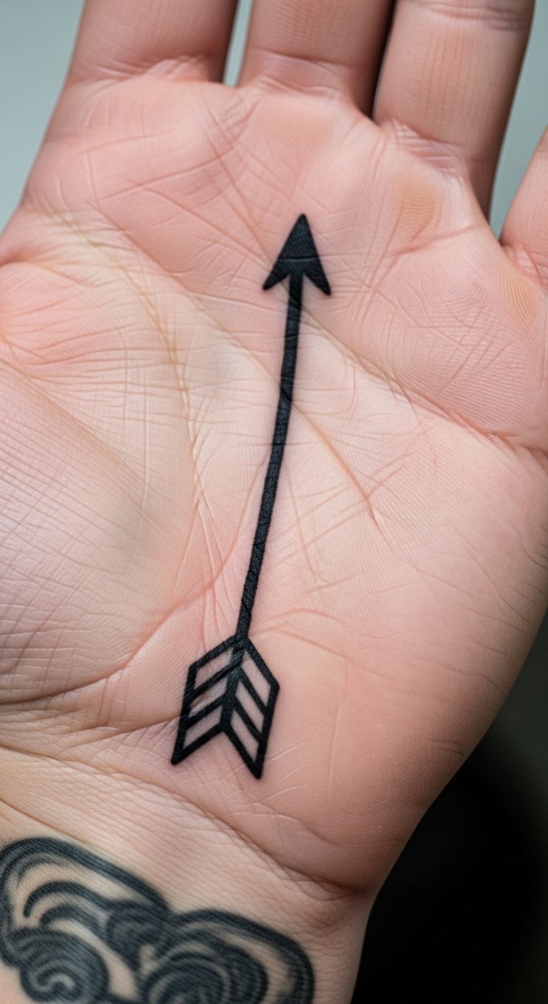 Arrows point to progress and direction. Aim one straight across your palm. Sketch arrows quickly at home. Find arrow pros with affordable rates. Bold the arrowhead for focus. Use barriers like bandages for protection. This symbol guides without complexity. Test with arrow stickers for placement.