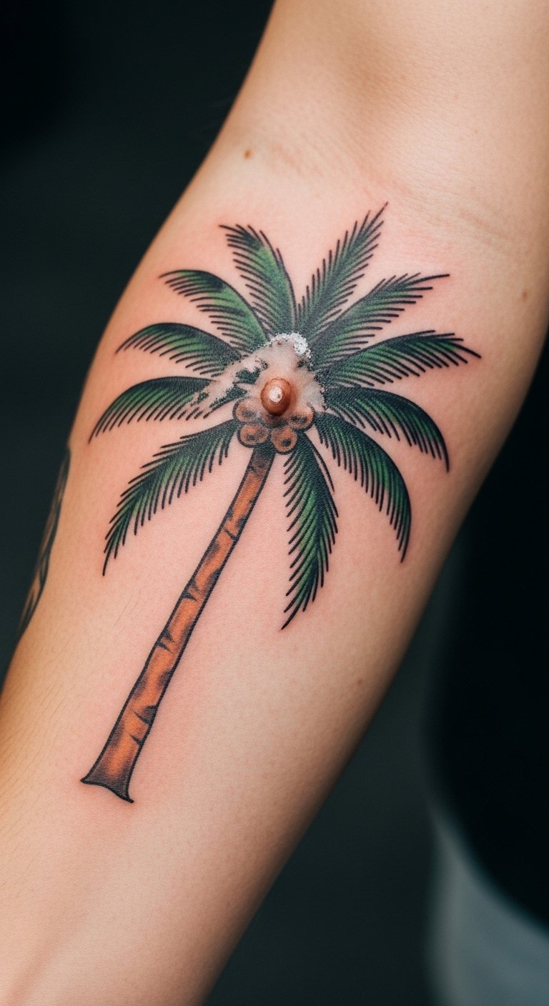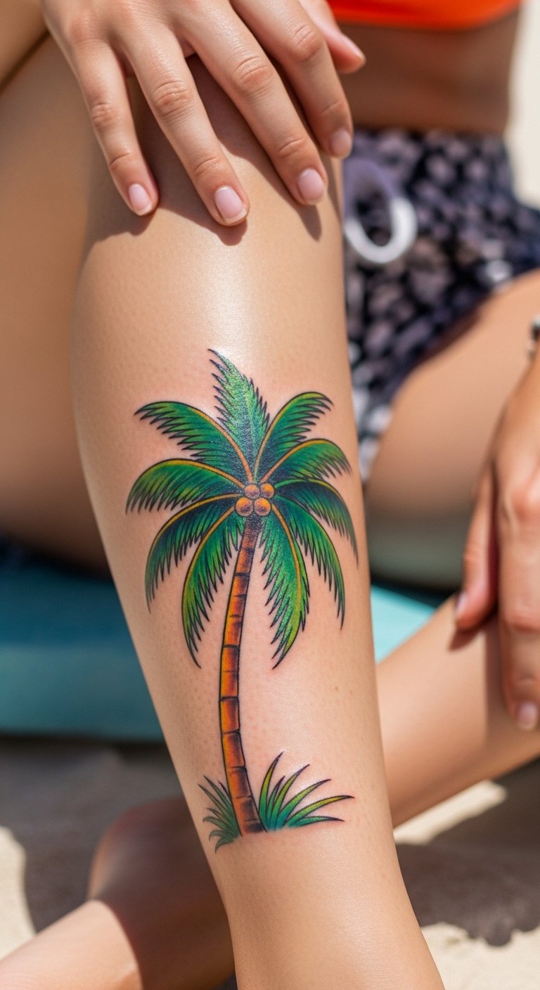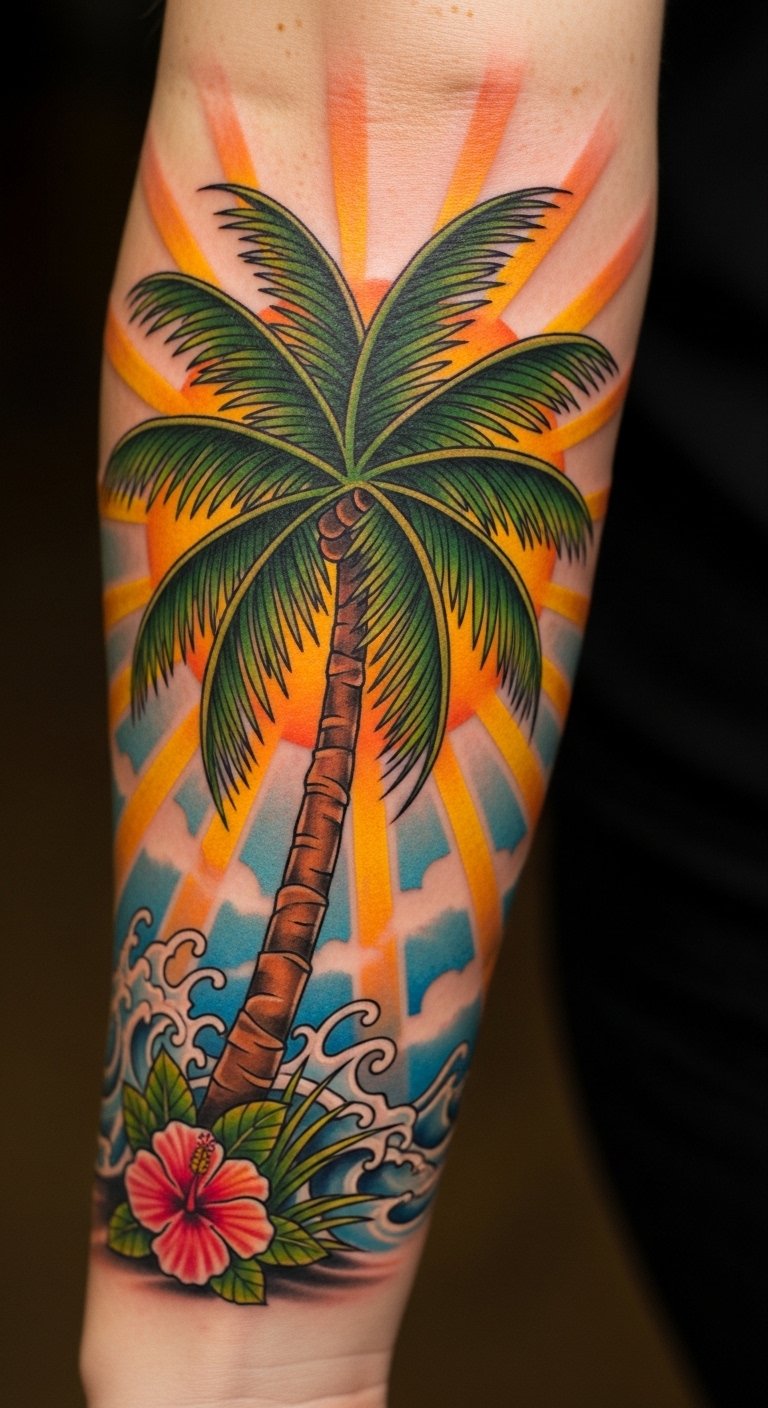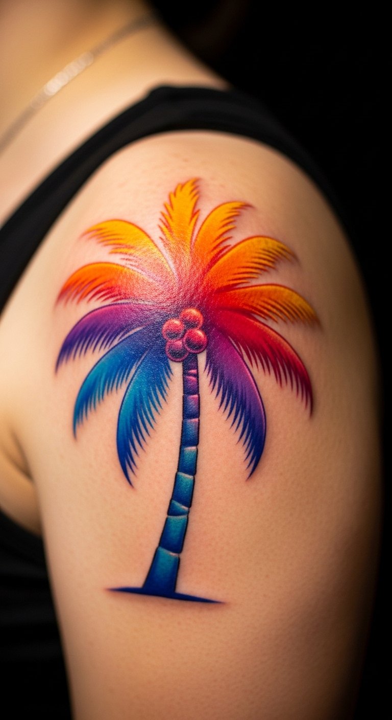 Go bold with a gradient palm tree that shifts colors like a sunset. Imagine blues fading into pinks on your arm. This catches eyes and adds flair to your style. Sketch ideas using colored pencils at home for free practice. Choose hues that match your favorite spots, like ocean tones. Placement on your shoulder lets you show it off in tanks. Save money by comparing artist quotes online; aim for deals around $150. Blend in elements like a small sun for extra meaning. After getting it, cover with breathable clothing to protect. Test with temporary tattoos from the dollar store first. This design brings beach energy every day. Keep it fresh by mixing with summer outfits.