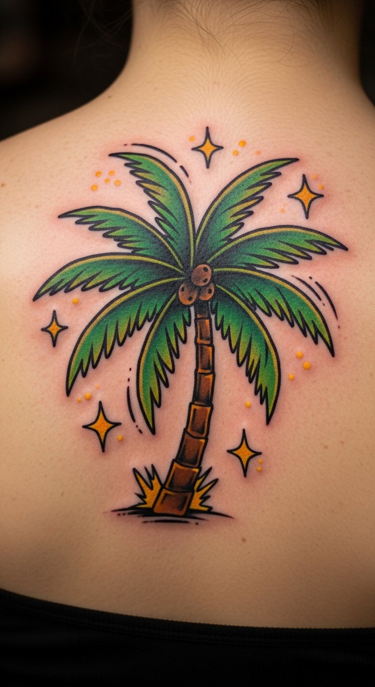 Shake things up with a new school palm tree, packed with creative twists and colors. Think fun elements like stars around the trunk on your back. Experiment at home with digital drawing tools that cost nothing. Make it unique by adding symbols that mean something to you. Spots like your back offer space for bigger ideas. Search for budget artists on platforms like Instagram; prices start at $180. Keep it light by focusing on joyful themes. Basic care involves avoiding sun initially—use sunscreen you own. Try a stick-on version first to gauge the design. This approach makes your tattoo a conversation starter. Pair it with adventurous outfits for maximum impact.