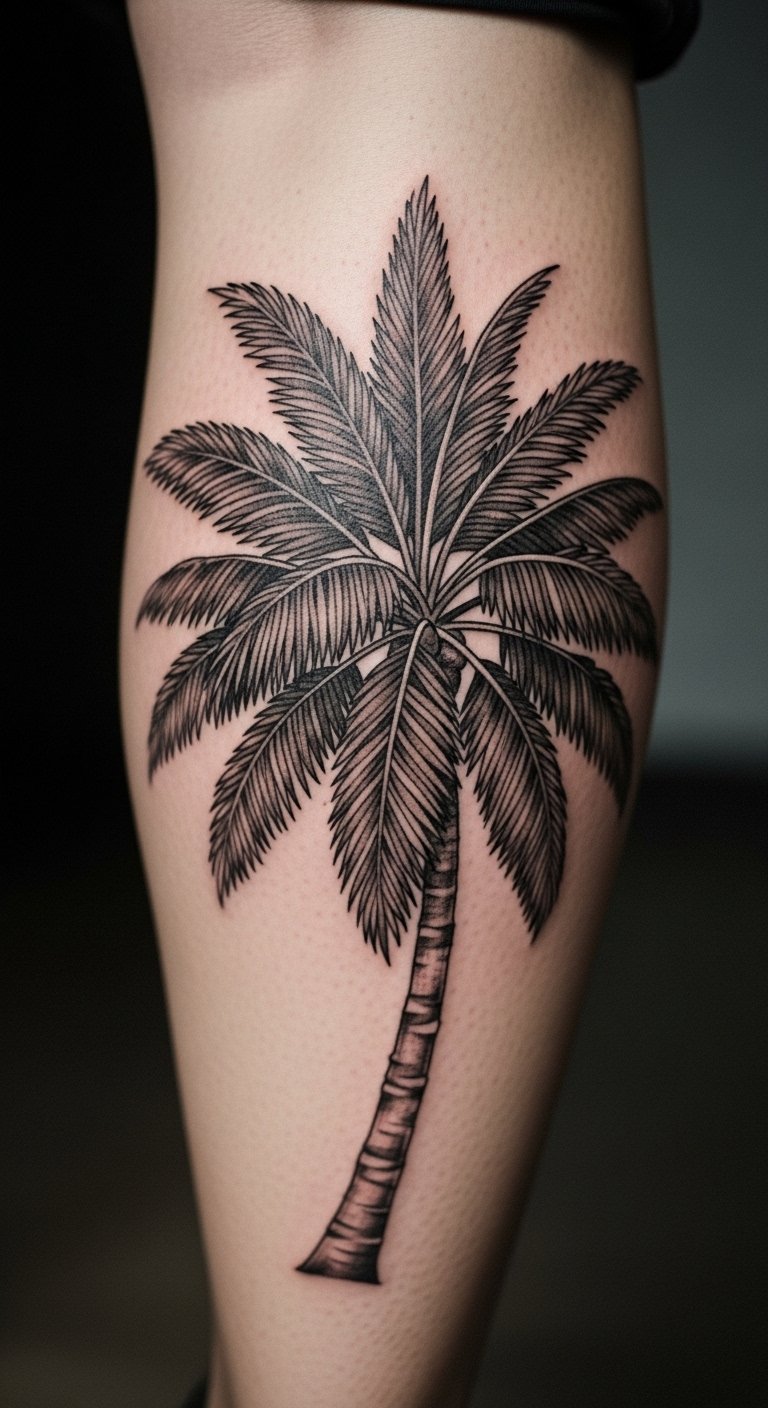 Go detailed with a palm tree full of leaves and textures on your calf. This style stands out and tells a tale. Practice drawing with free online templates. Add personal flourishes like birds for interest. Opt for areas that can handle complexity. Look for sales at studios; costs about $200. Make it meaningful with elements from your life. Care involves gentle washing. Experiment with henna for a trial. It makes your tattoo a work of art. Display it with shorts for effect.