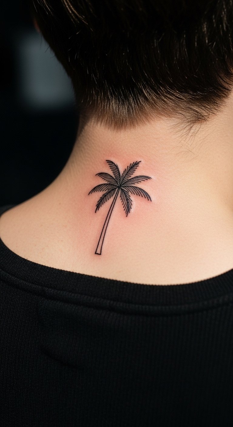 Stick to simple line work for a palm tree on your neck—clean and modern. This keeps it understated yet cool. Draw it freehand with a pen at home. Keep additions minimal for elegance. It’s perfect for visible spots. Find budget artists online; under $100. Infuse your story into the lines. Use soap for easy care. Test with washable ink. This design fits any wardrobe. Show it off daily.