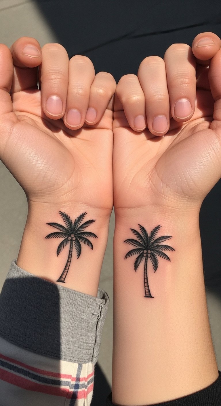 Place a palm tree on your wrist for a discreet yet stylish choice. This spot shows off the design with every gesture. Sketch it small on paper to fit perfectly. Add a thin line for a wave if you’re a beach fan. It’s ideal for daily wear and easy to cover if needed. Look for walk-in studios to save; costs might be under $100. Personalize with initials for a personal touch. Clean gently with soap from your bathroom. Test with a temporary stamp before going permanent. This placement keeps things practical and visible. Match it with bracelets for a complete look.