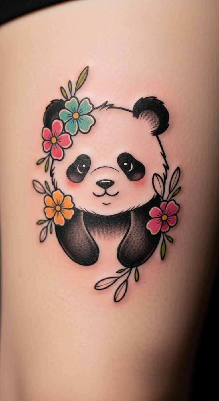 Go with a cute panda surrounded by flowers on your thigh for a cheerful twist. Bright blooms make it pop with joy. This design means gentleness and beauty. Draw simple flowers with colored pencils at home. Free floral templates online can guide you. Pick artists offering cute styles for around $130. Watch for seasonal sales to cut costs. Add your favorite flower for a personal touch. Use it to brighten your day. Practice on paper with stickers; they cost pennies and help visualize. Make tweaks easily before deciding.