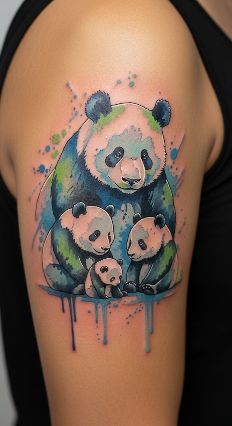 Opt for a watercolour panda family on your upper arm to celebrate bonds. Soft hues show pandas together in harmony. It represents family ties. Blend colors on paper with watercolors. Free family tree templates inspire layouts. Find watercolour pros for about $170. Look for group tattoo parties for savings. Include extra pandas for your loved ones. This adds heart without high cost. Share it as a connection symbol. Test with washable paints on skin; they’re low-cost and temporary. Adjust as needed.