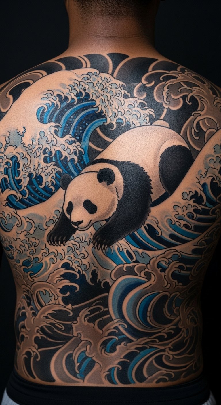 Pick a Neo-Japanese panda with waves on your back for ocean flow. Waves surround the panda in motion. It represents adaptability. Draw waves with curves. Free wave patterns online inspire. Find Neo-Japanese pros for about $220. Ask about wave add-ons. Make it your journey symbol. This stays budget-friendly. Share it as a tale. Practice with wave drawings; they’re simple. Prepare well.