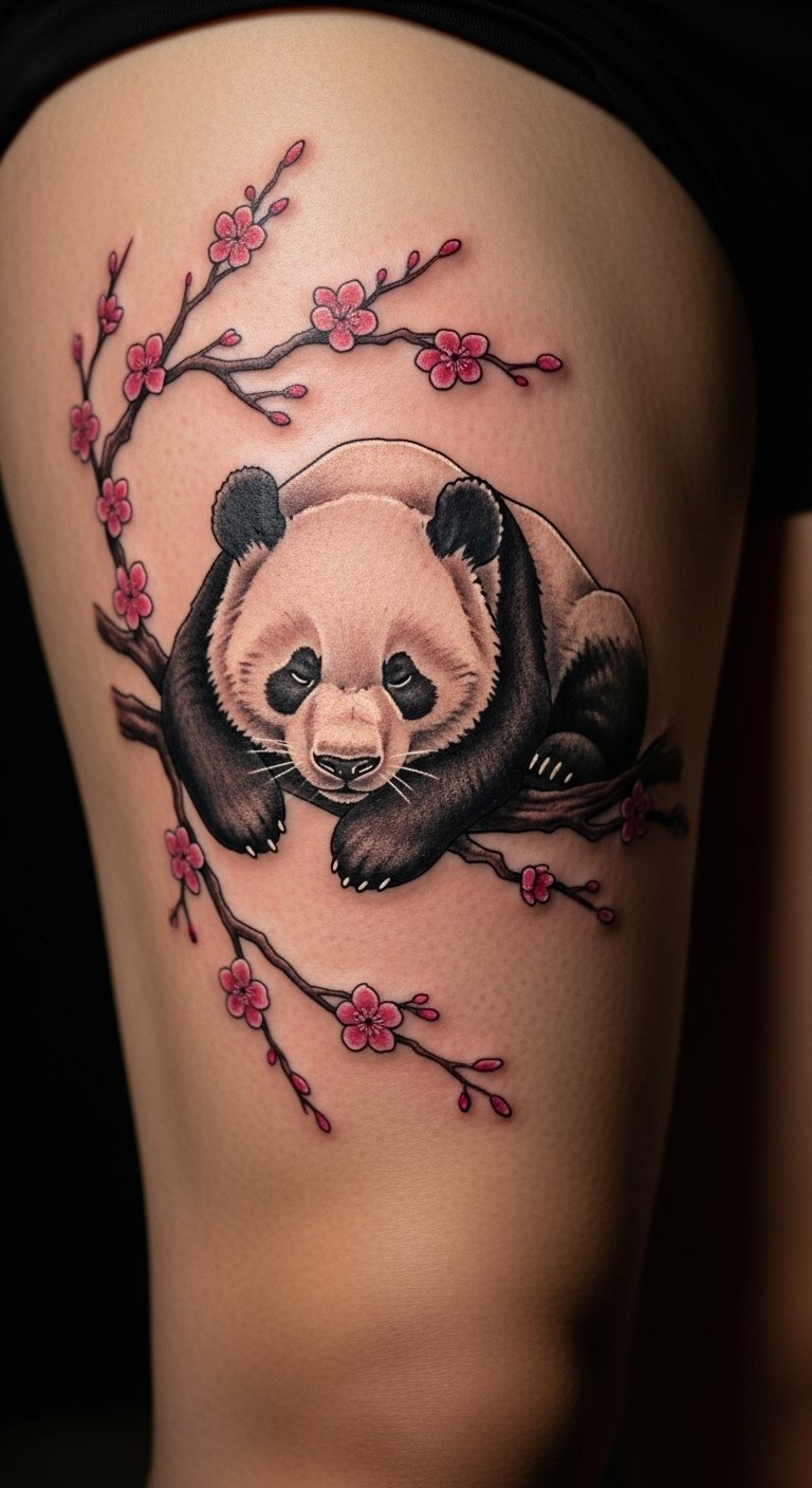 Choose a panda with a cherry branch on your thigh for seasonal beauty. Branches frame the panda in bloom. It means renewal. Draw branches with pinks. Free branch designs help. Select branch experts for around $140. Inquire about floral rates. Add petals for you. This adds charm affordably. Bloom with it. Test with branch rubbings; they’re free. Plan ahead.