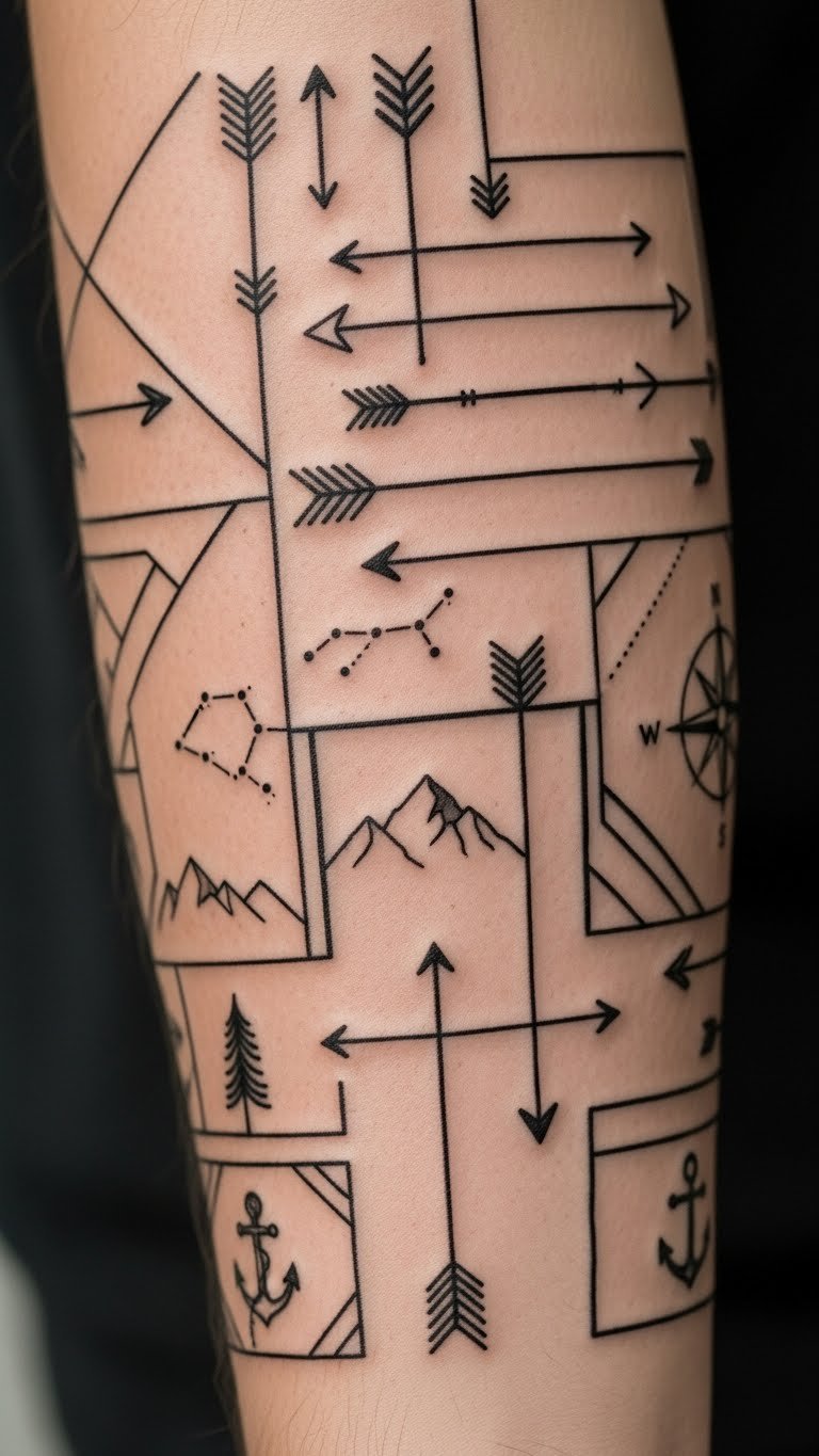 Arrow paths guide your way. Pick an arrow for your forearm. Find $30 path options. Map arrows on maps. Weave into existing ink. Bold the hint: direct your flow. Use string to trace paths at home. It navigates your art simply.