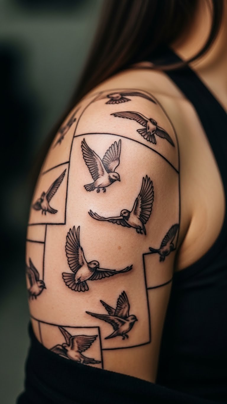 Bird flocks symbolize freedom. Start with a bird on your shoulder. Studios offer $40 flock deals. Draw birds on windows. Let them fly across skin. Bold the idea: spread wings. Use bird photos for sketches. It lifts your spirit without cost.
