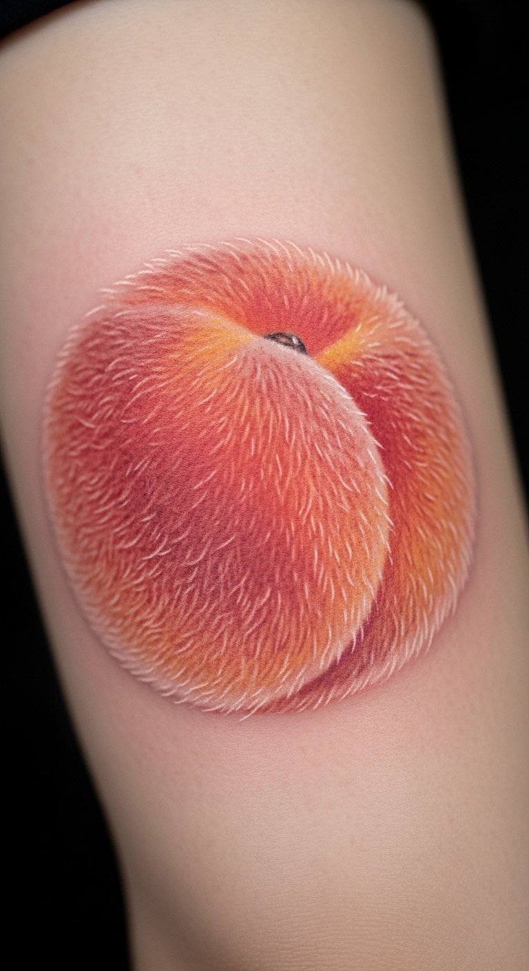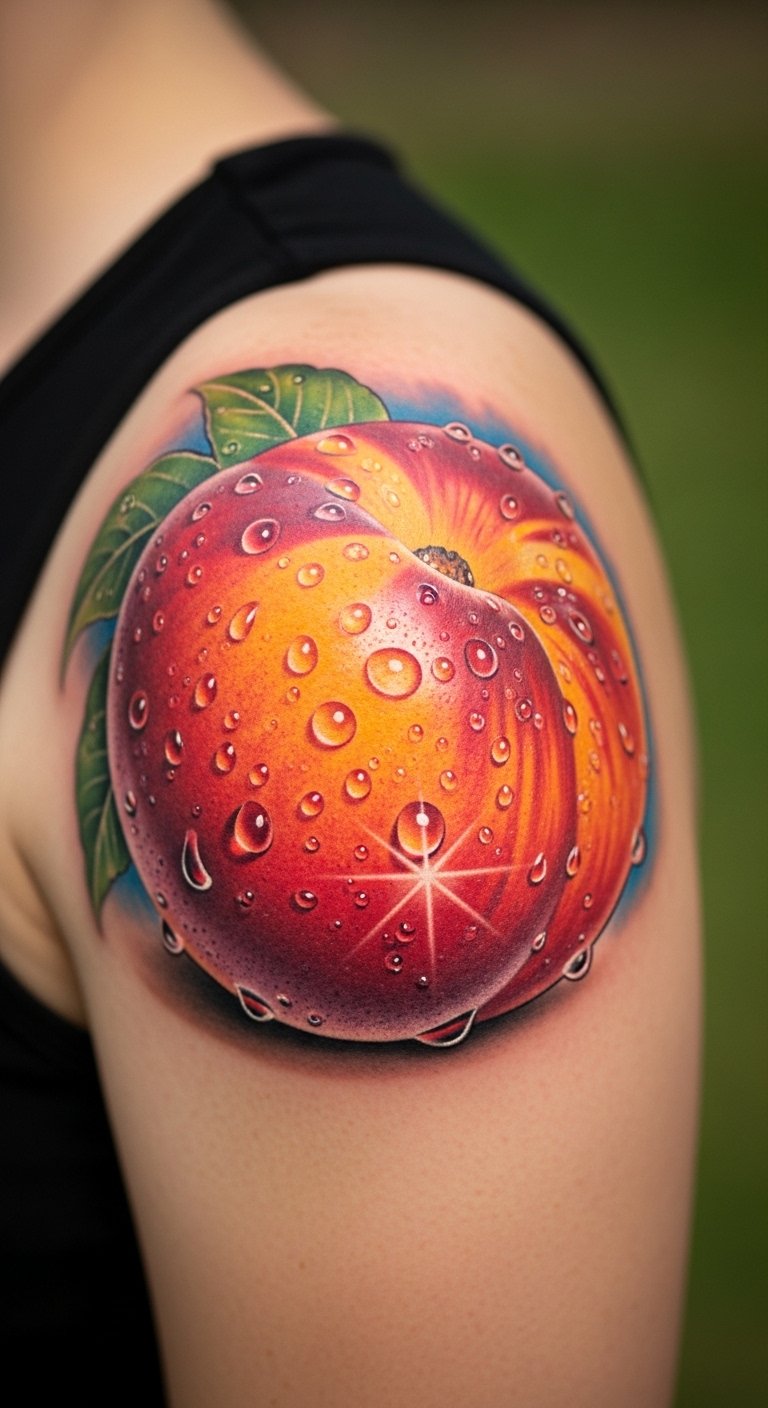 Go bold with colors. A realistic peach with dew drops pops on skin. Choose bright oranges and reds. It looks like real fruit. Place it on your shoulder for visibility. Find an artist skilled in shading—costs $150 to $300. Draw inspiration from photos online. Print one and modify it. Add personal touches like a leaf. Book a consultation first. Discuss colors that suit you. Apply it in one go if possible. Sunscreen helps it last. Style with tank tops to show it off. This design celebrates life’s beauty. Use phone apps to visualize it on your body. Snap a pic and overlay the design. Keep sessions short to save time. Enjoy the process. It turns into a daily reminder of optimism.