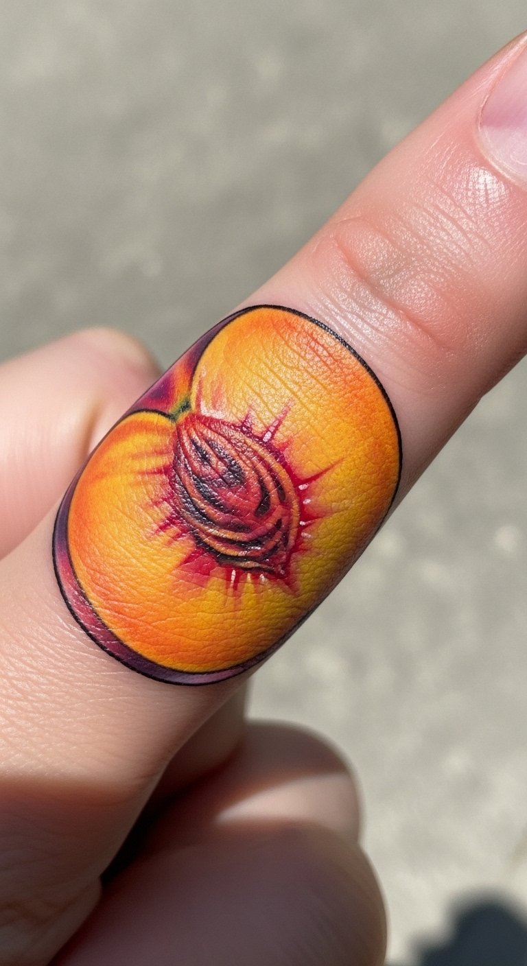 Make it playful. A vibrant peach slice on your finger stands out. Pick yellows and oranges for pop. Place it where you see it often. Costs range from $60 to $120. Cut out paper shapes to plan. Glue them on your hand. Add juice drops for flair. Talk to artists about finger specifics. They know how to make it last. Wrap it carefully after. Gloves help in daily tasks. This tattoo adds a fruity twist to routines. Coordinate with rings. Use nail polish to mimic it temporarily. Quick and inexpensive.