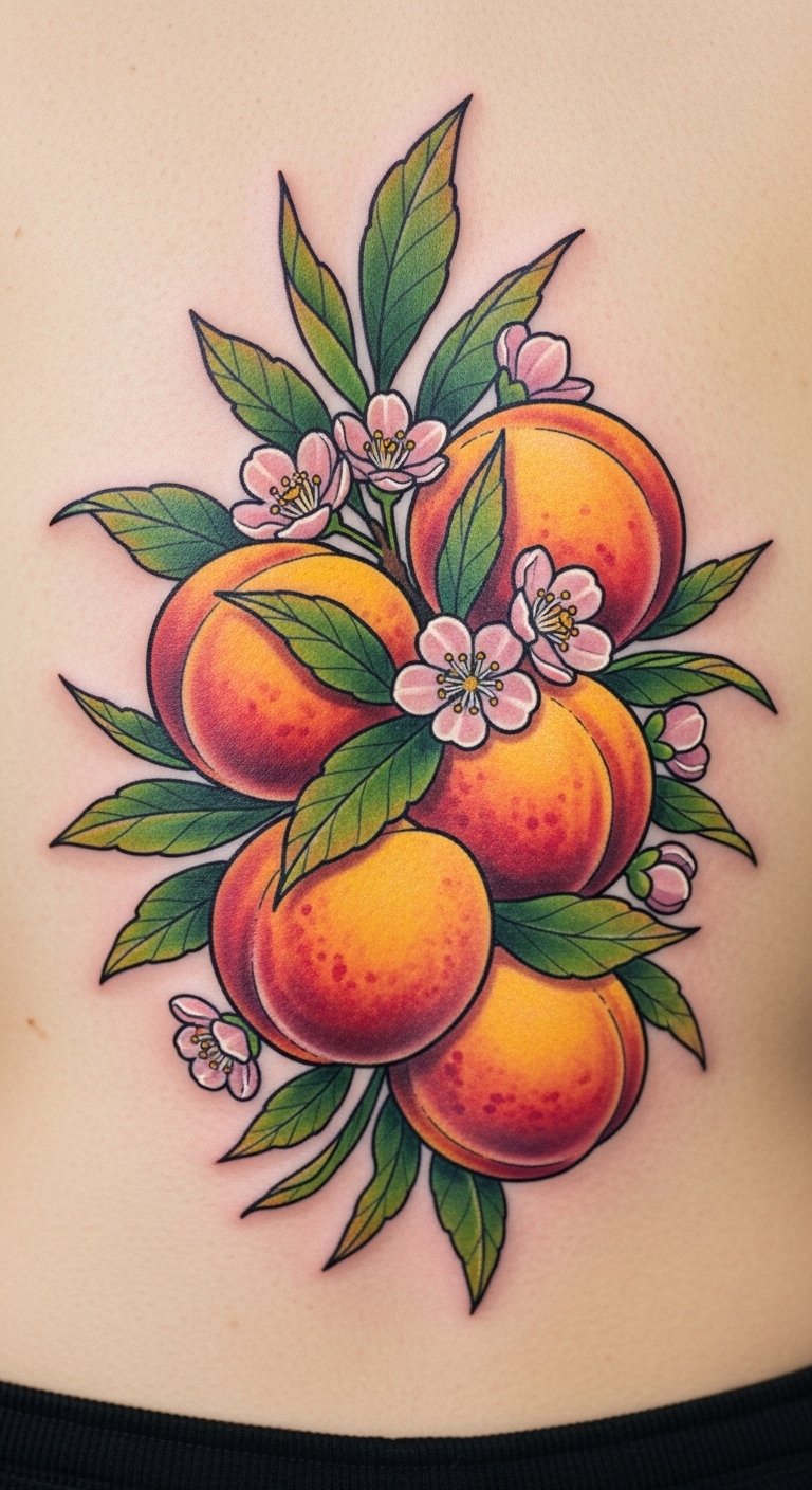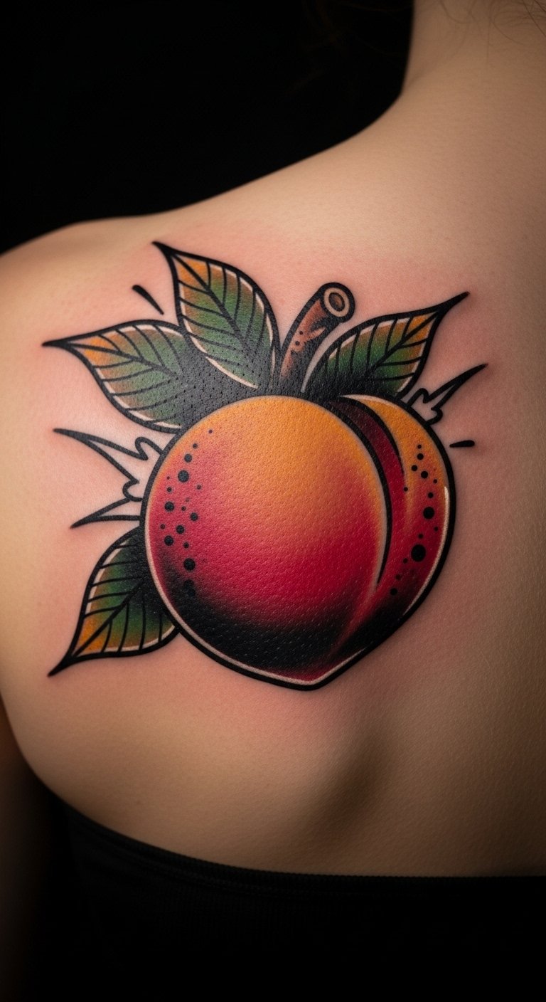 Step up the style. A neo-traditional peach uses bold lines and colors. Position it on your upper back for impact. Prices hit $200 to $400. Trace bold designs at home. Use markers for outlines. Incorporate elements like patterns. Consult artists on trends. Schedule for comfort. Use pillow covers post-session. This design mixes old and new vibes. Pair with fitted shirts. Draw it on with washable pens first. Easy to erase mistakes.