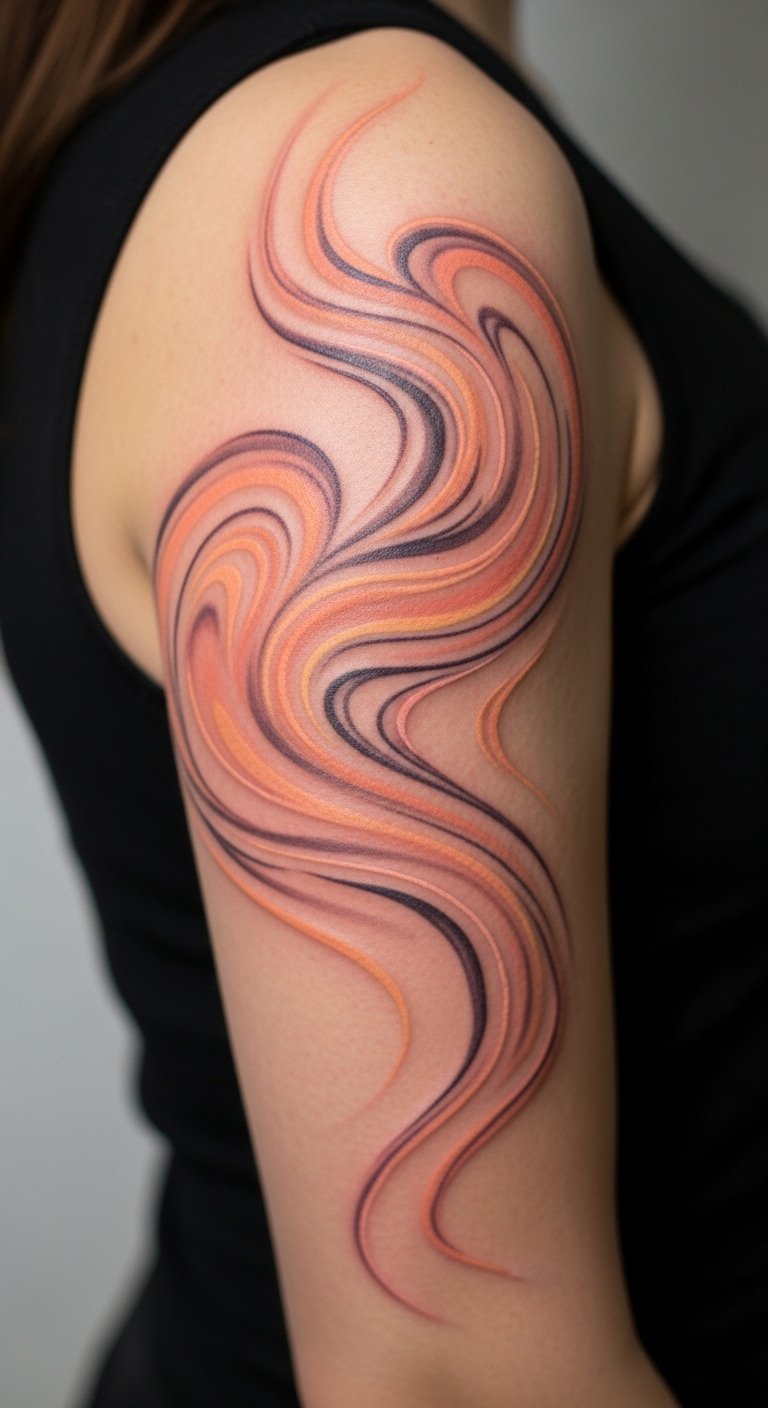 Get creative with swirls. An abstract peach design flows on the rib. Blend colors for a modern feel. Fees are about $150. Doodle swirls on paper. Try different flows. Make it unique with twists. Discuss pain points with your artist. Opt for numbing cream. Bandages aid healing. This tattoo represents optimism in art. Match with loose tops. Simulate with body paint at home. Fun and low-cost.