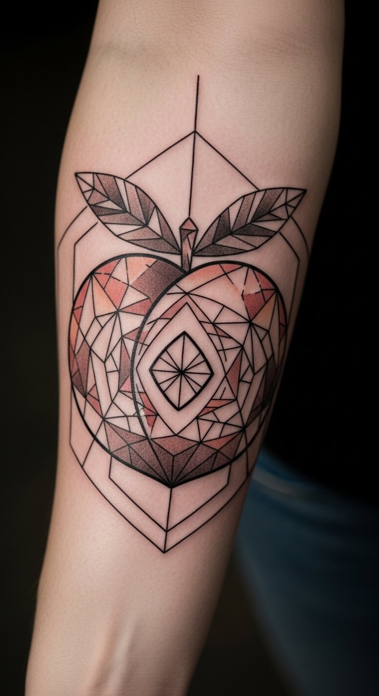 Mix shapes. A geometric peach on the forearm adds edge. Combine triangles and circles. Expect $120. Design grids at home. Use rulers for accuracy. Personalize with symbols. Get artist feedback. Protect during activities. Watches hide it if wanted. Try with stencils. Budget smart.